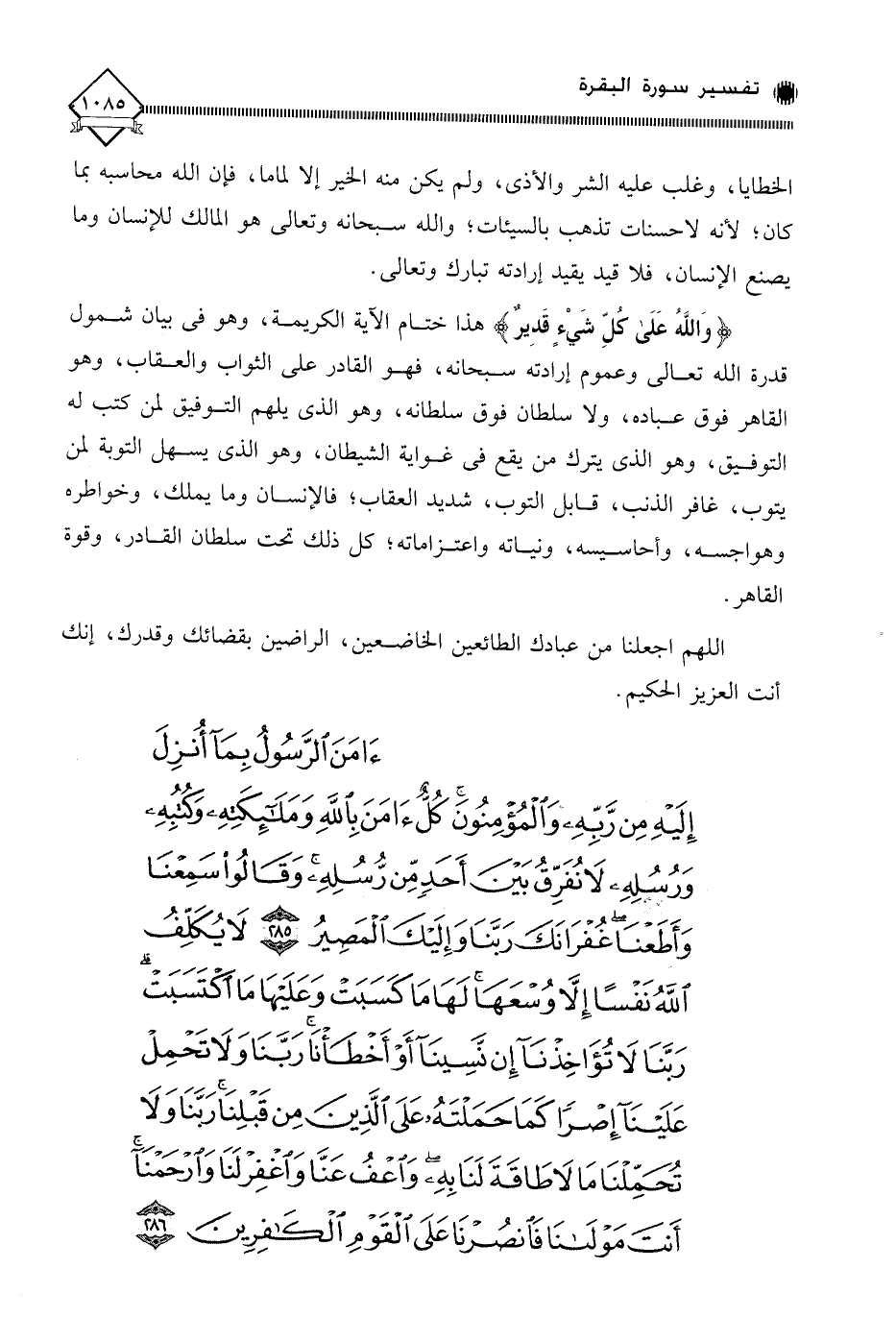 (آمَنَ الرَّسُولُ بِمَا أُنْزِلَ إِلَيْهِ مِنْ رَبِّهِ وَالْمُؤْمِنُونَ كُلٌّ آمَنَ بِاللَّهِ وَمَلَائِكَتِهِ وَكُتُبِهِ وَرُسُلِهِ لَا نُفَرِّقُ بَيْنَ أَحَدٍ مِنْ رُسُلِهِ وَقَالُوا سَمِعْنَا وَأَطَعْنَا غُفْرَانَكَ رَبَّنَا وَإِلَيْكَ الْمَصِيرُ (285) لَا يُكَلِّفُ اللَّهُ نَفْسًا إِلَّا وُسْعَهَا لَهَا مَا كَسَبَتْ وَعَلَيْهَا مَا اكْتَسَبَتْ رَبَّنَا لَا تُؤَاخِذْنَا إِنْ نَسِينَا أَوْ أَخْطَأْنَا رَبَّنَا وَلَا تَحْمِلْ عَلَيْنَا إِصْرًا كَمَا حَمَلْتَهُ عَلَى الَّذِينَ مِنْ قَبْلِنَا رَبَّنَا وَلَا تُحَمِّلْنَا مَا لَا طَاقَةَ لَنَا بِهِ وَاعْفُ عَنَّا وَاغْفِرْ لَنَا وَارْحَمْنَا أَنْتَ مَوْلَانَا فَانْصُرْنَا عَلَى الْقَوْمِ الْكَافِرِينَ (286)