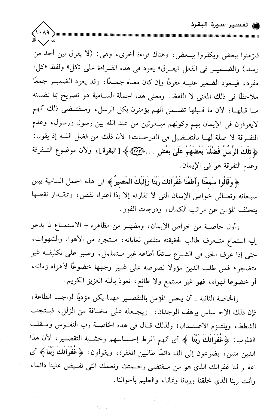 فيؤمنوا ببعض ويكفروا ببعض، وهناك قراءة أخرى، وهي: (لا يفرق بين أحد من رسله) والضمير في الفعل " يفرق " يعود في هذه القراءة على " كل " ولفظ " كل " مفرد، فيعود الضمير عليه مفردًا وإن كان معناه جمعًا، وقد يعود الضمير جمعًا ملاحظًا في ذلك المعنى لَا اللفظ. ومعنى هذه الجملة السامية هو تصريح بما تضمنه ما قبلها، لأن ما قبلها تضمن أنهم يؤمنون بكل الرسل، ومقتضى ذلك أنهم لايفرقون في الإيمان بهم وكونهم مبعوثين من عند الله بين رسول ورسول، وعدم التفرقة لَا صلة لها بالتفضيل في الدرجات؛ لأنَّ ذلك من فضل الله إذ يقول: (تِلْكَ الرُّسُلُ فَضَّلْنَا بَعْضَهُمْ عَلَى بَعْضٍ ... )، ولأن موضوع التفرقة وعدم التفرقة هو في الإيمان.