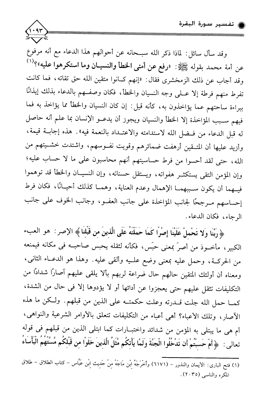 وقد سأل سائل: لماذا ذكر الله سبحانه عن أحوالهم هذا الدعاء مع أنه مرفوع عن أمة محمد بقوله - صلى الله عليه وسلم -: " رفع عن أمتي الخطأ والنسيان وما استكرهوا عليه "؟ (¬1) وقد أجاب عن ذلك الزمخشري فقال: " إنهم كانوا متقين الله حق تقاته، فما كانت تفرط منهم فرطة إلا على وجه النسيان والخطأ، فكان وصفهم بالدعاء بذلك إيذانًا ببراءة ساحتهم عما يؤاخذون به، كأنه قيل: إن كان النسيان والخطأ مما يؤاخذ به فما فيهم سبب المؤاخذة إلا الخطأ والنسيان ويجوز أن يدعو الإنسان بما علم أنه حاصل له قبل الدعاء من فضل الله لاستدامته والاعتداد بالنعمة فيه ". هذه إجابة قيمة، وأزيد عليها أن المتقين أرهفت ضمائرهم وقويت نفوسهم، واشتدت خشيتهم من الله، حتى لقد أحسوا من فرط حساسيتهم أنهم محاسبون على ما لَا حساب عليه؛ وإن المؤمن التقي يستكثر هفواته، ويستقل حسناته، وإن النسيان والخطأ قد توهموا فيهما أن يكون سببهما الإهمال وعدم العناية، وهما كذلك أحيانًا، فكان فرط إحساسهم مرجحًا لجانب المؤاخذة على جانب العفو، وجانب الخوف على جانب الرجاء، فكان الدعاء.