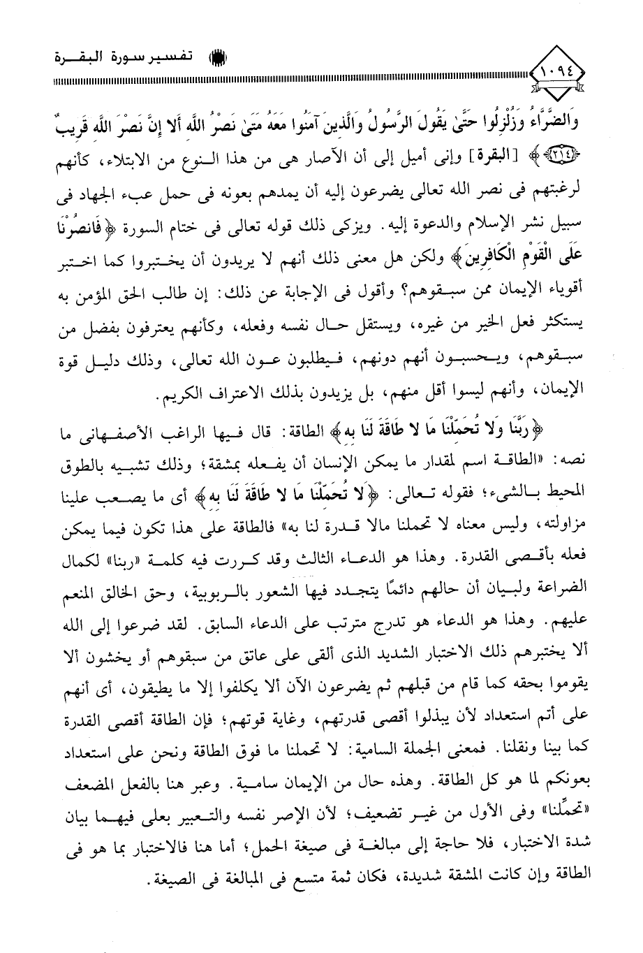 (رَبَّنَا وَلَا تُحَمِّلْنَا مَا لَا طَاقَةَ لَنَا بِهِ) الطاقة: قال فيها الراغب الأصفهاني ما نصه: " الطاقة اسم لمقدار ما يمكن الإنسان أن يفعله بمشقة؛ وذلك تشبيه بالطوق المحيط بالشيء؛ فقوله تعالى: (لا تُحَمِّلْنَا مَا لَا طَاقَةَ لَنَا بِهِ) أي ما يصعب علينا مزاولته، وليس معناه لَا تحملنا ما لَا قدرة لنا به؛ فالطاقة على هذا تكون فيما يمكن فعله بأقصى القدرة. وهذا هو الدعاء الثالث وقد كررت فيه كلمة " ربنا " لكمال الضراعة ولبيان أن حالهم دائمًا يتجدد فيها الشعور بالربوبية، وحق الخالق المنعم عليهم. وهذا هو الدعاء هو تدرج مترتب على الدعاء السابق. لقد ضرعوا إلى الله ألا يختبرهم ذلك الاختبار الشديد الذي أُلقيَ على عاتق من سبقوهم أو يخشون ألا يقوموا بحقه كما قام من قبلهم ثم يضرعون الآن ألا يكلفوا إلا ما يطيقون، أي أنهم على أتم استعداد لأن يبذلوا أقصى قدرتهم، وغاية قوتهم؛ فإن الطاقة أقصى القدرة كما بينا ونقلنا. فمعنى الجملة السامية: لَا تحملنا ما فوق الطاقة ونحن على استعداد بعونكم لما هو كل الطاقة. وهذه حال من الإيمان سامية. وعبر هنا بالفعل المضعف " تحمِّلنا " وفي الأول من غير تضعيف؛ لأن الإصر نفسه والتعبير بعلى فيهما بيان شدة الاختبار، فلا حاجة إلى مبالغة في صيغة الحمل؛ أما هنا فالاختبار بما هو في الطاقة وإن كانت المشقة شديدة، فكان ثمة متسع في المبالغة في الصيغة.