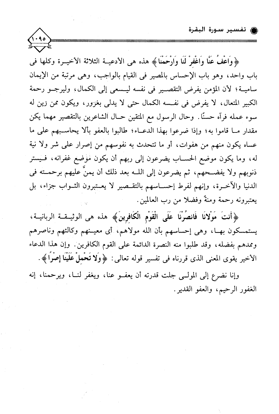 (وَاعْفُ عَنَّا وَاغْفِرْ لَنَا وَارْحَمْنَا) هذه هي الأدعية الثلاثة الأخيرة وكلها في باب واحد، وهو باب الإحساس بالمصير في القيام بالواجب، وهي مرتبة من الإيمان سامية؛ لأن المؤمن يفرض التقصير في نفسه ليسعى إلى الكمال، وليرجو رحمة الكبير المتعال، لَا يفرض في نفسه الكمال حتى لَا يدلى بغرور، ويكون ممن زُين له سوء عمله فرآه حسنًا. وحال الرسول مع المتقين حال الشاعرين بالتقصير مهما يكن مقدار ما قاموا به؛ وإذا ضرعوا بهذا الدعاء؛ طالبوا بالعفو بألا يحاسبهم على ما عساه يكون منهم من هفوات، أو ما تتحدث به نفوسهم من إصرار على شر ولا نية له، وما يكون موضع الحساب يضرعون إلى ربهم أن يكون موضع غفرانه، فيستر ذنوبهم ولا يفضحهم، ثم يضرعون إلى الله بعد ذلك أن يمنَّ عليهم برحمته في الدنيا والآخرة، وإنهم لفرط إحساسهم بالتقصير لَا يعتبرون الثواب جزاء، بل يعتبرونه رحمة ومنةً وفضلا من رب العالمين.