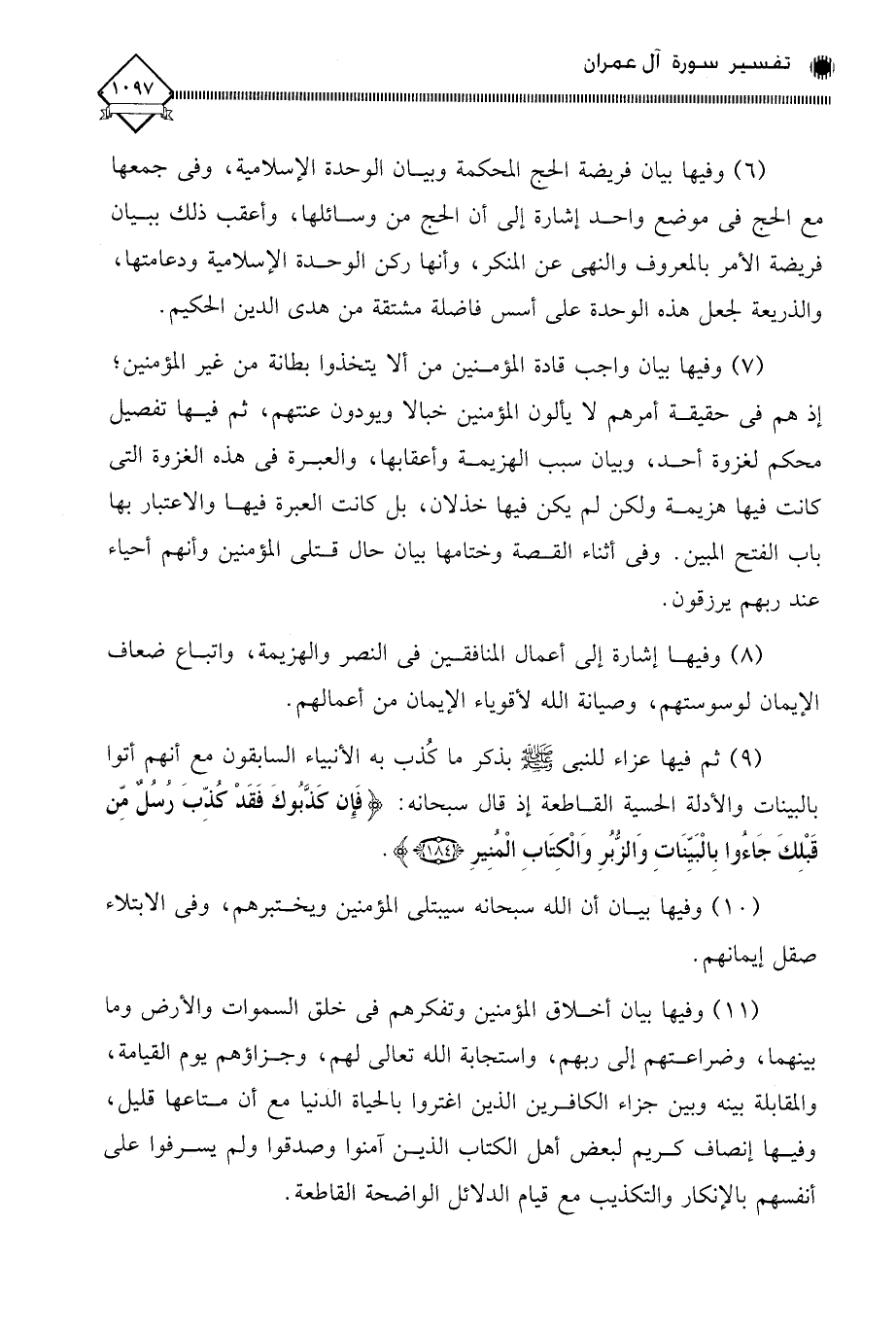 (7) وفيها بيان واجب قادة المؤمنين من ألا يتخذوا بطانة من غير المؤمنين؛ إذ هم في حقيقة أمرهم لَا يألون المؤمنين خبالا ويودون عنتهم، ثم فيها تفصيل محكم لغزوة أحد، وبيان سبب الهزيمة وأعقابها، والعبرة في هذه الغزوة التي كانت فيها هزيمة ولكن لم يكن فيها خذلان، بل كانت العبرة فيها والاعتبار بها باب الفتح المبين. وفي أثناء القصة وختامها بيان حال قتلى المؤمنين وأنهم أحياء عند ربهم يرزقون.