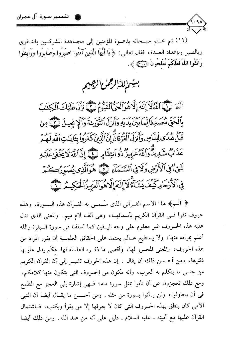 الم (1) اللَّهُ لَا إِلَهَ إِلَّا هُوَ الْحَيُّ الْقَيُّومُ (2) نَزَّلَ عَلَيْكَ الْكِتَابَ بِالْحَقِّ مُصَدِّقًا لِمَا بَيْنَ يَدَيْهِ وَأَنْزَلَ التَّوْرَاةَ وَالْإِنْجِيلَ (3) مِنْ قَبْلُ هُدًى لِلنَّاسِ وَأَنْزَلَ الْفُرْقَانَ إِنَّ الَّذِينَ كَفَرُوا بِآيَاتِ اللَّهِ لَهُمْ عَذَابٌ شَدِيدٌ وَاللَّهُ عَزِيزٌ ذُو انْتِقَامٍ (4) إِنَّ اللَّهَ لَا يَخْفَى عَلَيْهِ شَيْءٌ فِي الْأَرْضِ وَلَا فِي السَّمَاءِ (5) هُوَ الَّذِي يُصَوِّرُكُمْ فِي الْأَرْحَامِ كَيْفَ يَشَاءُ لَا إِلَهَ إِلَّا هُوَ الْعَزِيزُ الْحَكِيمُ (6)