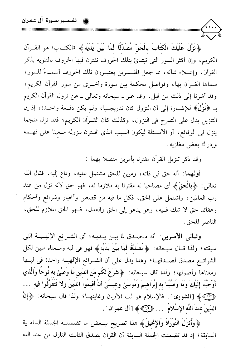 (نَزَّلَ عَلَيْكَ الْكِتَابَ بِالْحَقِّ مُصَدِّقًا لِمَا بَيْنَ يَدَيْهِ ... (3) الكتاب: هو القرآن الكريم، وإن أكثر السور التي تبتدئ بتلك الحروف تقترن فيها الحروف بالتنويه بذكر القرآن، وإعلاء شأنه، مما جعل المفسرين يعتبرون تلك الحروف أسماءً للسور، سماها القرآن بها، وفواصل محكمة بين سورة وأخرى من سور القرآن الكريم، وقد أشرنا إلى ذلك من قبل. وقد عبر - سبحانه وتعالى - عن نزول القرآن الكريم بـ (نَزَّلَ) للإشارة إلى أن النزول كان تدريجيا، ولم يكن دفعة واحدة، إذ إن التنزيل يدل على التدرج في النزول، وكذلك كان القرآن الكريم؛ فقد نزل منجما ينزل في الوقائع، أو الأسئلة ليكون السبب الذي اقترن بنزوله معِينا على فهمه وإدراك بعض مغازيه.