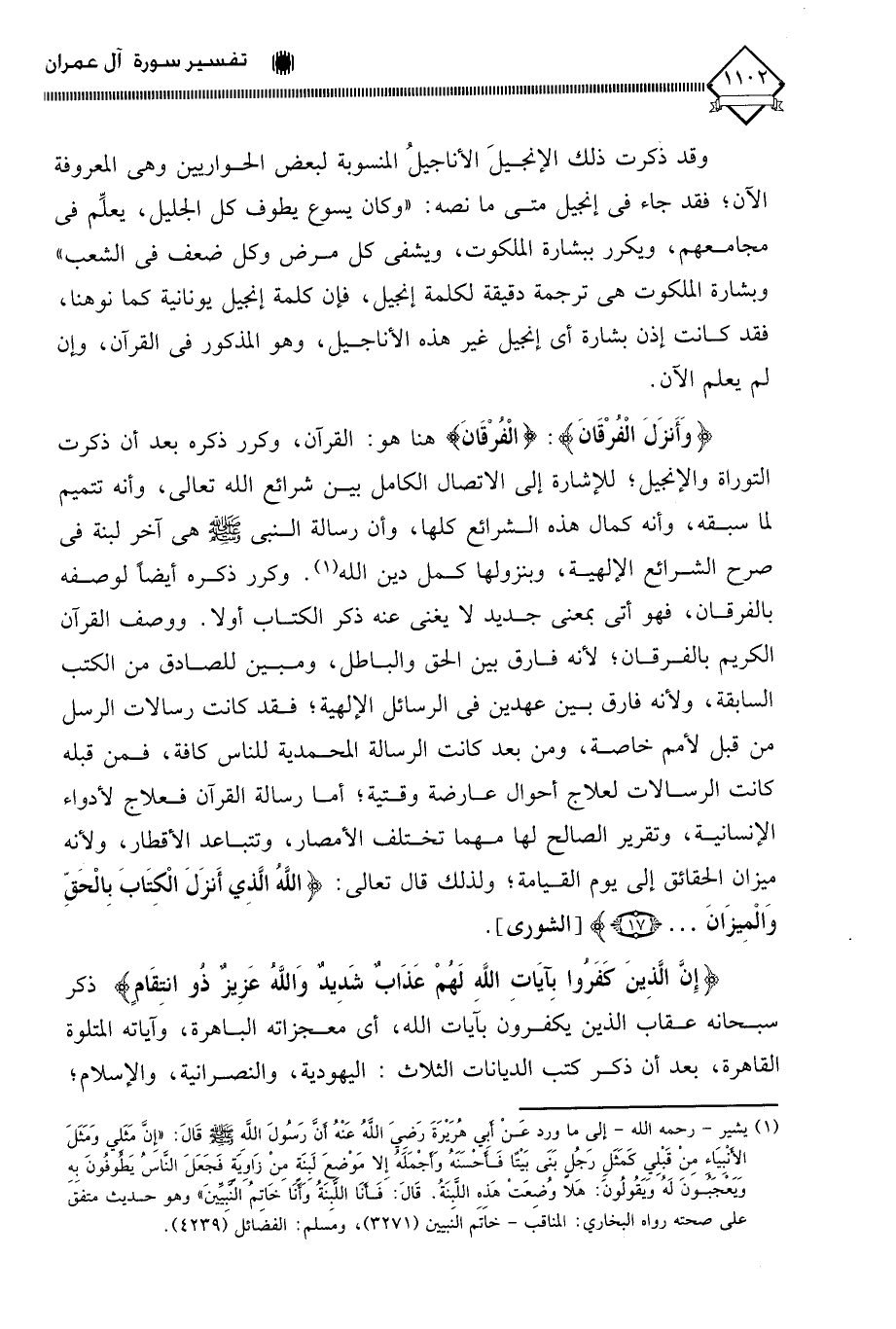 (وَأَنزَلَ الْفُرْقَانَ): (الْفُرْقَانَ) هنا هو: القرآن، وكرر ذكره بعد أن ذكرت التوراة والإنجيل، للإشارة إلى الاتصال الكامل بين شرائع الله تعالى، وأنه تتميم لما سبقه، وأنه كمال هذه الشرائع كلها، وأن رسالة النبي - صلى الله عليه وسلم - هي آخر لبنة في صرح الشرائع الإلهية، وبنزولها كمل دين الله (¬1). وكرر ذكره أيضا لوصفه بالفرقان، فهو أتى بمعنى جديد لَا يغني عنه ذكر الكتاب أولا. ووصف القرآن الكريم بالفرقان، لأنه فارق بين الحق والباطل، ومبين للصادق من الكتب السابقة، ولأنه فارق بين عهدين في الرسائل الإلهية؛ فقد كانت رسالات الرسل من قبل لأمم خاصة، ومن بعد كانت الرسالة المحمدية للناس كافة، فمن قبله كانت الرسالات لعلاج أحوال عارضة وقتية؛ أما رسالة القرآن فعلاج لأدواء الإنسانية، وتقرير الصالح لها مهما تختلف الأمصار، وتتباعد الأقطار، ولأنه ميزان الحقائق إلى يوم القيامة؛ ولذلك قال تعالى: (اللَّهُ الَّذِي أَنزَلَ الْكِتَابَ بِالْحَقِّ وَالْمِيزَانَ. . .).