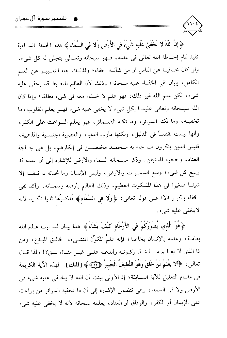 هذه الجملة السامية تفيد تمام إحاطة الله تعالى في علمه، فهو سبحانه وتعالى يتجلى له كل شيء، ولو كان خافيا عن الناس أو من شأنه الخفاء؛ ولذلك جاء التعبير عن العلم الكامل، ببيان نفي الخفاء عليه سبحانه؛ وذلك لأن العالِم المحيط قد يخفى عليه شيء، لكن علم الله غير ذلك، فهو علم لَا خفاء معه في شيء مطلقا؛ وإذا كان الله سبحانه وتعالى عليما بكل شيء لَا يخفى عليه شيء فهو يعلم القلوب وما تخفيه، وما تكنه السرائر، وما تكنه الضمائر، فهو يعلم البواعث على الكفر، وأنها ليست نقصاً في الدليل، ولكنها مآرب الدنيا، والعصبية الجنسية والمذهبية، فليس الذين ينكرون ما جاء به محمد مخلصين في إنكارهم، بل هي لجاجة العناد، وجحود المستيقن. وذكر سبحانه السماء والأرض للإشارة إلى أن علمه قد وسع كل شيء؛ وسع السماوات والأرض، وليس الإنسان وما تحدثه به نفسه إلا شيئا صغيرا في هذا الملكوت العظيم، وذلك العالم بأرضه وسمائه. وأكد نفي الخفاء بتكرار " لا " في قوله تعالى: (وَلا فِي السَّمَاءِ) فَذكرُها ثانيا تأكيد لأنه لا يخفى عليه شيء.