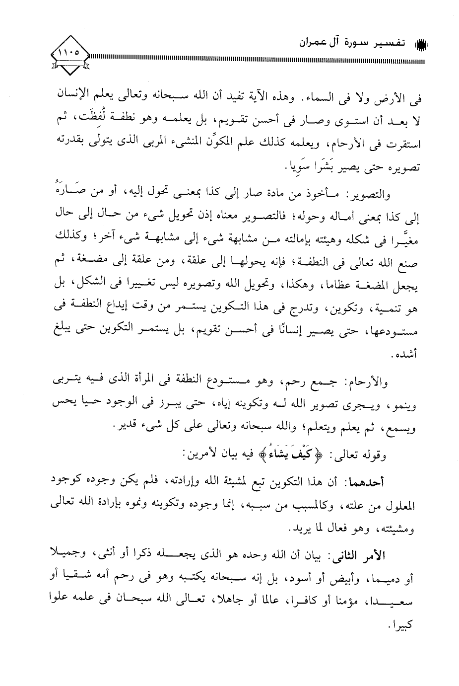 فى الأرض ولا في السماء. وهذه الآية تفيد أن الله سبحانه وتعالى يعلم الإنسان لا بعد أن استوى وصار في أحسن تقويم، بل يعلمه وهو نطفة لُفِظَت، ثم استقرت في الأرحام، ويعلمه كذلك علم المكوِّن المنشئ المربي الذي يتولى بقدرته تصويره حتى يصير بَشَرا سَوِيا.