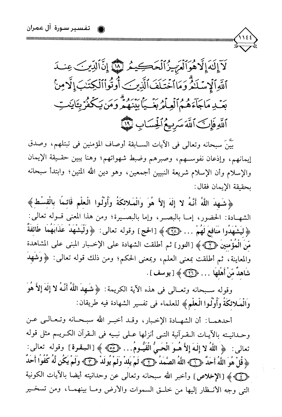 شَهِدَ اللَّهُ أَنَّهُ لَا إِلَهَ إِلَّا هُوَ وَالْمَلَائِكَةُ وَأُولُو الْعِلْمِ قَائِمًا بِالْقِسْطِ لَا إِلَهَ إِلَّا هُوَ الْعَزِيزُ الْحَكِيمُ (18) إِنَّ الدِّينَ عِنْدَ اللَّهِ الْإِسْلَامُ وَمَا اخْتَلَفَ الَّذِينَ أُوتُوا الْكِتَابَ إِلَّا مِنْ بَعْدِ مَا جَاءَهُمُ الْعِلْمُ بَغْيًا بَيْنَهُمْ وَمَنْ يَكْفُرْ بِآيَاتِ اللَّهِ فَإِنَّ اللَّهَ سَرِيعُ الْحِسَابِ (19)