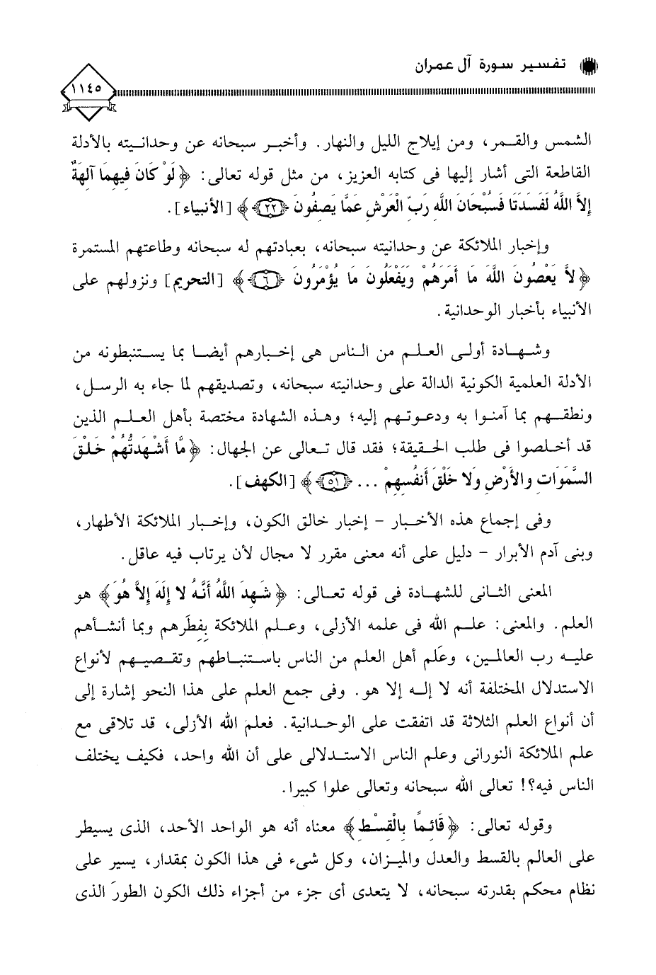 وقوله تعالى: (قَائِمًا بِالْقِسْطِ) معناه أنه هو الواحد الأحد، الذي يسيطر على العالم بالقسط والعدل والميزان، وكل شيء في هذا الكون بمقدار، يسير على نظام محكم بقدرته سبحانه، لَا يتعدى أي جزء من أجزاء ذلك الكون الطورَ الذي