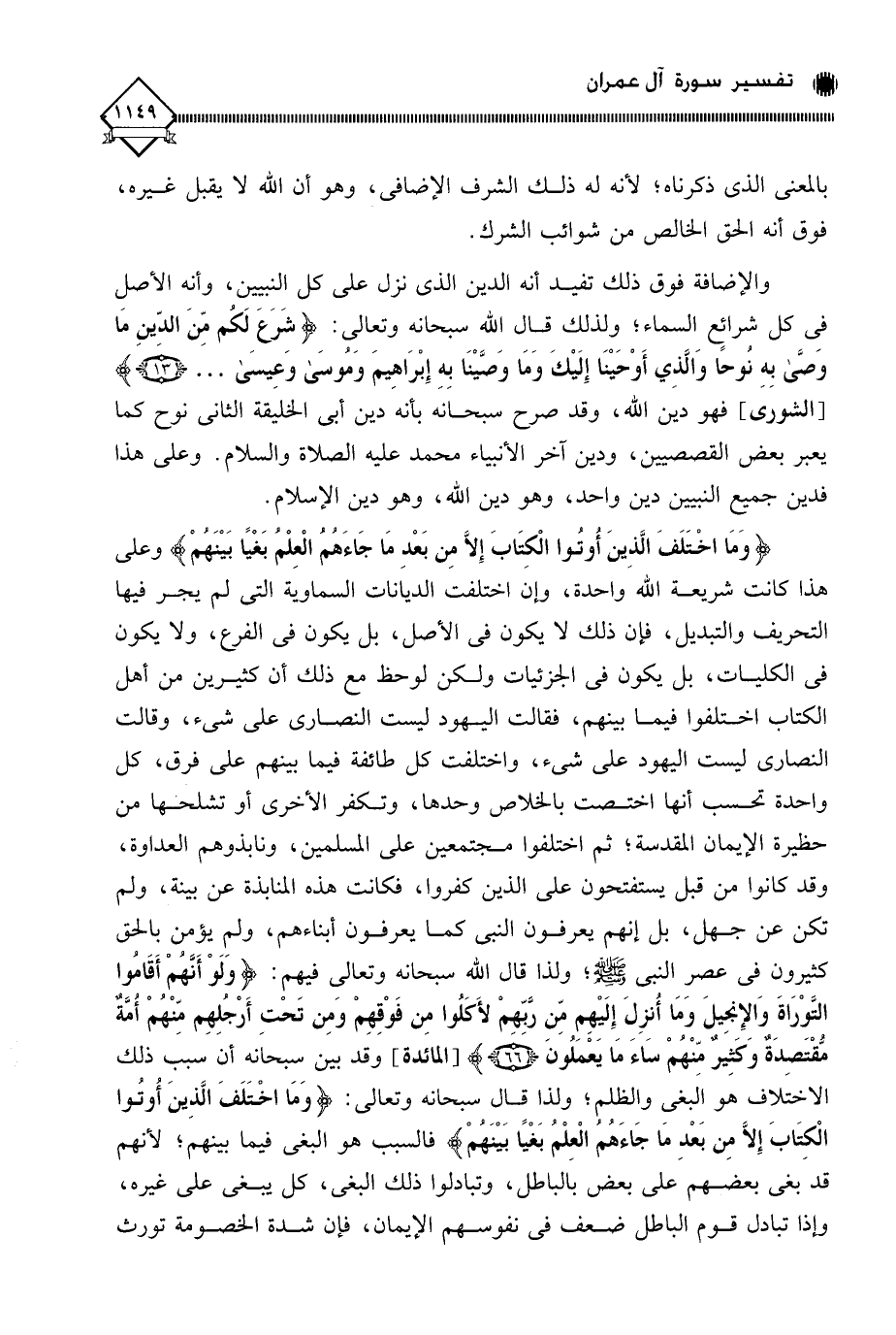 (وَمَا اخْتَلَفَ الَّذِينَ أُوتُوا الْكِتَابَ إِلَّا مِن بَعْدِ مَا جَاءَهُمُ الْعِلْمُ بَغْيًا بَيْنَهُمْ) وعلى هذا كانت شريعة الله واحدة، وإن اختلفت الديانات السماوية التي لم يجر فيها التحريف والتبديل، فإن ذلك لَا يكون في الأصل، بل يكون في الفرع، ولا يكون في الكليات، بل يكون في الجزئيات ولكن لوحظ مع ذلك أن كثيرين من أهل الكتاب اختلفوا فيما بينهم، فقالت اليهود ليست النصارى على شيء، وقالت النصارى ليست اليهود على شيء، واختلفت كل طائفة فيما بينهم على فرق، كل واحدة تحسب أنها اختصت بالخلاص وحدها، وتكفر الأخرى أو تشلحها من حظيرة الإيمان المقدسة؛ ثم اختلفوا مجتمعين على المسلمين، ونابذوهم العداوة، وقد كانوا من قبل يستفتحون على الذين كفروا، فكانت هذه المنابذة عن بينة، ولم تكن عن جهل، بل إنهم يعرفون النبي كما يعرفون أبناءهم، ولم يؤمن بالحق كثيرون في عصر النبي - صلى الله عليه وسلم -؛ ولذا قال الله سبحانه وتعالى فيهم: (وَلَوْ أَنَّهُمْ أَقَامُوا التَّوْرَاةَ وَالْإِنْجِيلَ وَمَا أُنْزِلَ إِلَيْهِمْ مِنْ رَبِّهِمْ لَأَكَلُوا مِنْ فَوْقِهِمْ وَمِنْ تَحْتِ أَرْجُلِهِمْ مِنْهُمْ أُمَّةٌ مُقْتَصِدَةٌ وَكَثِيرٌ مِنْهُمْ سَاءَ مَا يَعْمَلُونَ (66).