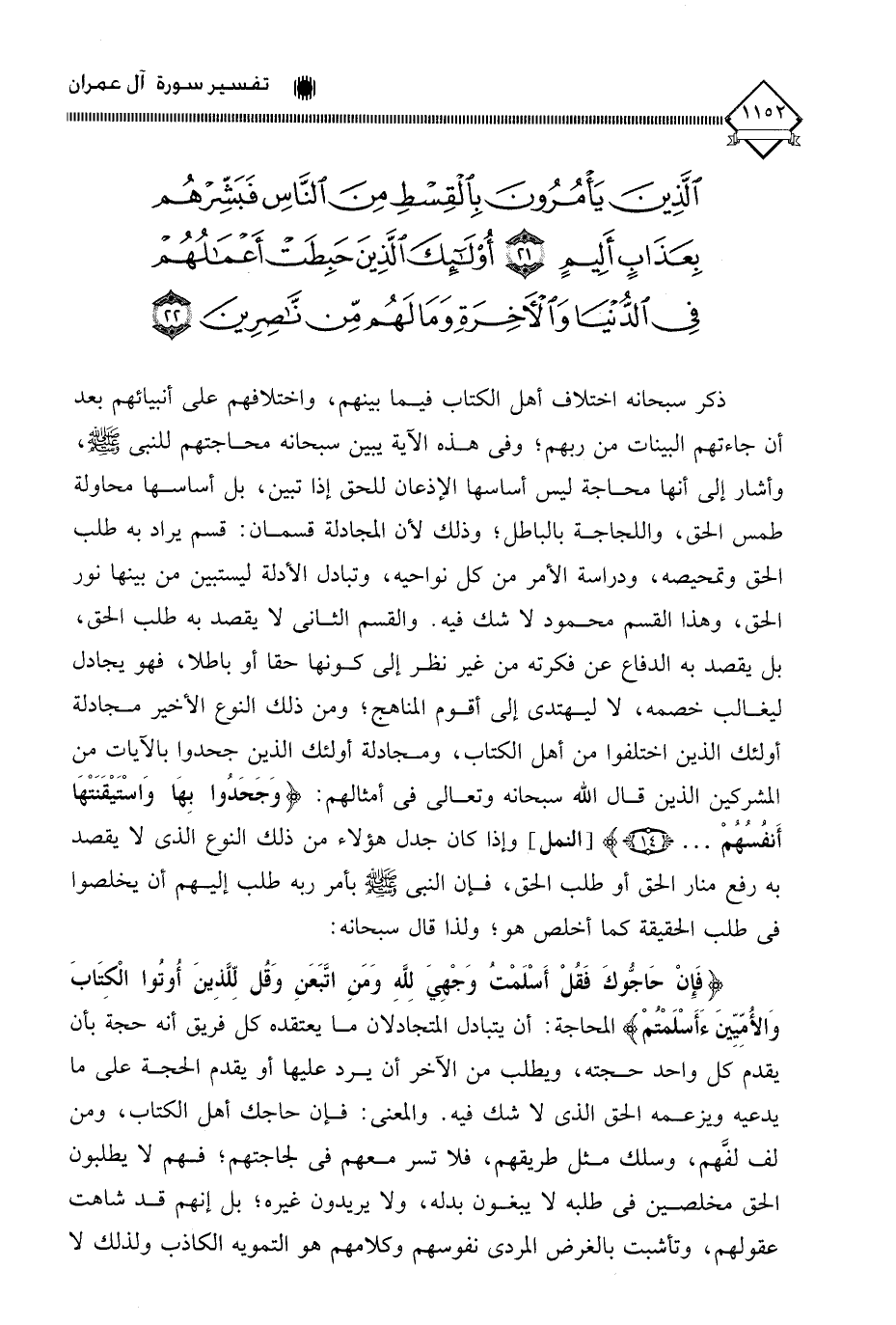 ذكر سبحانه اختلاف أهل الكتاب فيما بينهم، واختلافهم على أنبيائهم بعد أن جاءتهم البينات من ربهم؛ وفي هذه الآية يبين سبحانه محاجتهم للنبي - صلى الله عليه وسلم -، وأشار إلى أنها محاجة ليس أساسها الإذعان للحق إذا تبين، بل أساسها محاولة طمس الحق، واللجاجة بالباطل، وذلك لأن المجادلة قسمان: قسم يراد به طلب الحق وتمحيصه، ودراسة الأمر من كل نواحيه، وتبادل الأدلة ليستبين من بينها نور الحق، وهذا القسم محمود لَا شك فيه. والقسم الثاني لَا يقصد به طلب الحق، بل يقصد به الدفاع عن فكرته من غير نظر إلى كونها حقا أو باطلا، فهو يجادل ليغالب خصمه، لَا ليهتدي إلى أقوم المناهج، ومن ذلك النوع الأخير مجادلة أولئك الذين اختلفوا من أهل الكتاب، ومجادلة أولئك الذين جحدوا بالآيات من المشركين الذين قال الله سبحانه وتعالى في أمثالهم: (وَجَحَدُوا بِهَا وَاسْتَيْقَنَتْهَا أَنفُسُهُمْ. . .)، وإذا كان جدل هؤلاء من ذلك النوع الذي لَا يقصد به رفع منار الحق أو طلب الحق، فإن النبي - صلى الله عليه وسلم - بأمر ربه طلب إليهم أن يخلصوا في طلب الحقيقة كما أخلص هو، ولذا قال سبحانه: (فَإِنْ حَاجُّوكَ فَقُلْ أَسْلَمْتُ وَجْهِيَ لِلَّهِ وَمَنِ اتَّبَعَنِ وَقُل لِّلَّذِينَ أُوتُوا الْكِتَابَ وَالأُمِيِّينَءَ أَسْلَمْتُمْ) المحاجة: أن يتبادل المتجادلان ما يعتقده كل فريق أنه حجة بأن يقدم كل واحد حجته، ويطلب من الآخر أن يرد عليها أو يقدم الحجة على ما يدعيه ويزعمه الحق الذي لَا شك فيه. والمعنى: فإن حاجك أهل الكتاب، ومن لف لفَّهم، وسلك مثل طريقهم، فلا تسر معهم في لجاجتهم، فهم لَا يطلبون الحق مخلصين في طلبه لَا يبغون بدله، ولا يريدون غيره، بل إنهم قد شاهت عقولهم، وتأشبت بالغرض المردي نفوسهم وكلامهم هو التمويه الكاذب ولذلك لا
