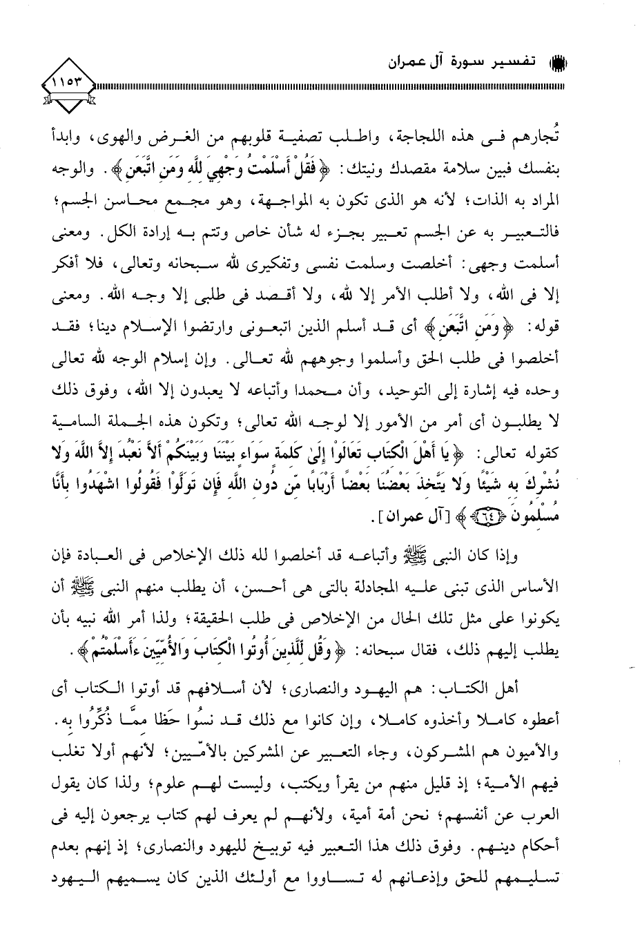 تُجارهم في هذه اللجاجة، واطلب تصفية قلوبهم من الغرض والهوى، وابدأ بنفسك فبين سلامة مقصدك ونيتك: (فَقلْ أَسْلَمْتُ وجْهِيَ لِلَّهِ وَمَنِ اتَّبَعَنِ). والوجه المراد به الذات، لأنه هو الذي تكون به المواجهة، وهو مجمع محاسن الجسم، فالتعبير به عن الجسم تعبير بجزء له شأن خاص وتتم به إرادة الكل. ومعنى أسلمت وجهي: أخلصت وسلمت نفسي وتفكيري لله سبحانه وتعالى، فلا أفكر إلا في الله، ولا أطلب الأمر إلا لله، ولا أقصد في طلبي إلا وجه الله. ومعنى قوله: (وَمَنِ اتَّبَعَنِ) أي قد أسلم الذين اتبعوني وارتضوا الإسلام دينا، فقد أخلصوا في طلب الحق وأسلموا وجوههم لله تعالى. وإن إسلام الوجه لله تعالى وحده فيه إشارة إلى التوحيد، وأن محمدا وأتباعه لَا يعبدون إلا الله، وفوق ذلك لا يطلبون أي أمر من الأمور إلا لوجه الله تعالى، وتكون هذه الجملة السامية كقوله تعالى: (قُلْ يَا أَهْلَ الْكِتَابِ تَعَالَوْا إِلَى كَلِمَةٍ سَوَاءٍ بَيْنَنَا وَبَيْنَكُمْ أَلَّا نَعْبُدَ إِلَّا اللَّهَ وَلَا نُشْرِكَ بِهِ شَيْئًا وَلَا يَتَّخِذَ بَعْضُنَا بَعْضًا أَرْبَابًا مِنْ دُونِ اللَّهِ فَإِنْ تَوَلَّوْا فَقُولُوا اشْهَدُوا بِأَنَّا مُسْلِمُونَ (64).