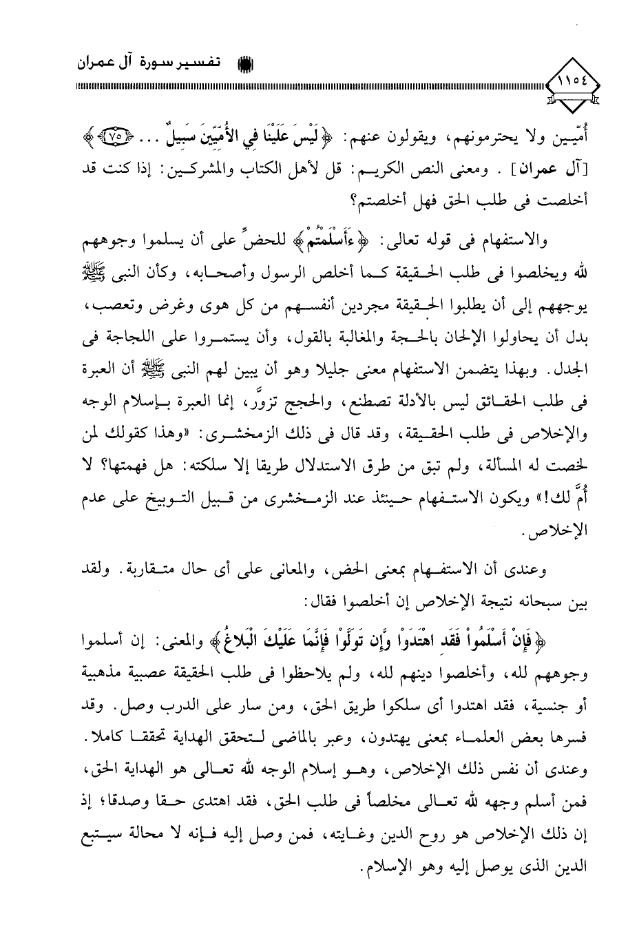 (فَإِنْ أَسْلَمُوأ فَقَدِ اهْتَدَوْا وَّإِن تَوَلَّوْا فَإِنَّمَا عَلَيْكَ الْبَلاغُ) والمعنى: إن أسلموا وجوههم لله، وأخلصوا دينهم لله، ولم يلاحظوا في طلب الحقيقة عصبية مذهبية أو جنسية، فقد اهتدوا أي سلكوا طريق الحق، ومن سار على الدرب وصل. وقد فسرها بعض العلماء بمعنى يهتدون، وعبر بالماضي لتحقق الهداية تحققا كاملا. وعندي أن نفس ذلك الإخلاص، وهو إسلام الوجه لله تعالى هو الهداية الحق، فمن أسلم وجهه لله تعالى مخلصا في طلب الحق، فقد اهتدى حقا وصدقا؛ إذ إن ذلك الإخلاص هو روح الدين وغايته، فمن وصل إليه فإنه لَا محالة سيتبع الدين الذي يوصل إليه وهو الإسلام.