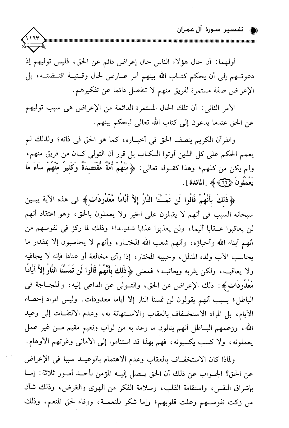 في هذه الآية يبين سبحانه السبب في أنهم لَا يقبلون على الخير ولا يعملون بالحق، وهو اعتقاد أنهم لن يعاقبوا عقابا أليما، ولن يعذبوا عذابا شديدا؛ وذلك لما ركز في نفوسهم من أنهم أبناء الله وأحباؤه، وأنهم شعب الله المختار، وأنهم لَا يحاسبون إلا بمقدار ما يحاسب الأب ولده المدلل، وحبيبه المختار، إذا رأى مخالفة أو عنادا فإنه لَا يجافيه ولا يعاقبه، ولكن يقربه ويعاتبه، فمعنى (ذَلِكَ بِأَنَّهُمْ قَالُوا لَنْ تَمَسَّنَا النَّارُ إِلَّا أَيَّامًا مَعْدُودَاتٍ): ذلك الإعراض عن الحق، والتولي عن الداعي إليه، واللجاجة في الباطل؛ بسبب أنهم يقولون لن تمسنا النار إلا أياما معدودات. وليس المراد إحصاء الأيام، بل المراد الاستخفاف بالعقاب والاستهانة به، وعدم الالتفات إلى وعيد الله، وزعمهم الباطل أنهم ينالون ما وعد به من ثواب ونعيم مقيم من غير عمل يعملونه، ولا كسب يكسبونه، فهم بهذا قد استناموا إلى الأماني وغرتهم الأوهام.