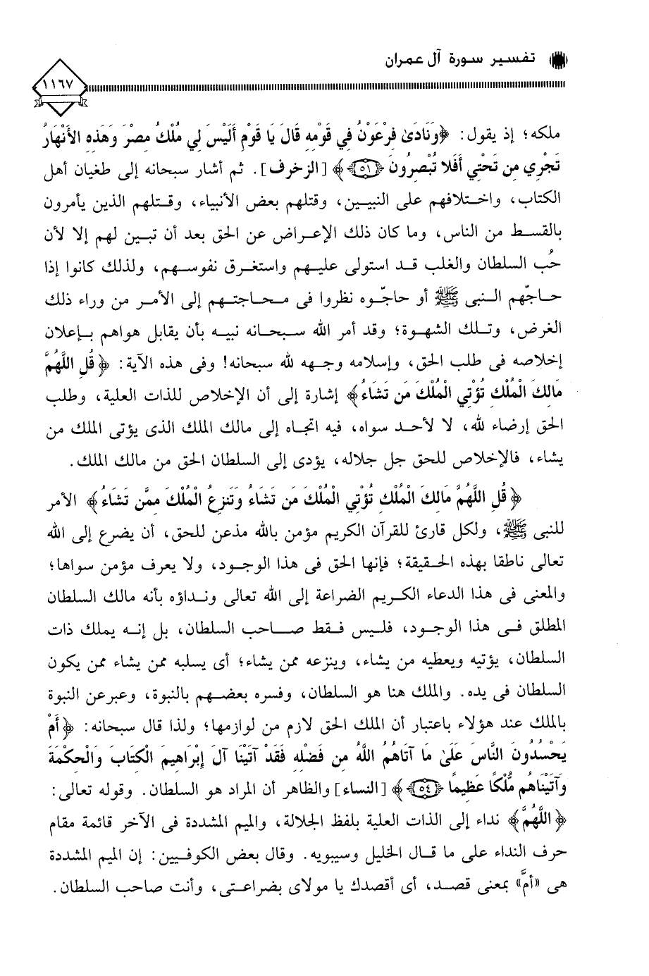 (قُلِ اللَّهُمَّ مَالِكَ الْمُلْكِ تؤْتِي الْمُلْكَ مَن تَشَاءُ وَتَنزِعُ الْمُلْكَ مِمَّن تَشَاءُ) الأمر للنبي - صلى الله عليه وسلم -، ولكل قارئ للقرآن الكريم مؤمن بالله مذعن للحق، أن يضرع إلى الله تعالى ناطقا بهذه الحقيقة؛ فإنها الحق في هذا الوجود، ولا يعرف مؤمن سواها؛ والمعنى في هذا الدعاء الكريم الضراعة إلى الله تعالى ونداؤه بأنه مالك السلطان المطلق في هذا الوجود، فليس فقط صاحب السلطان، بل إنه يملك ذات السلطان، يؤتيه ويعطيه من يشاء، وينزعه ممن يشاء؛ أي يسلبه ممن يشاء ممن يكون السلطان في يده. والملك هنا هو السلطان، وفسره بعضهم بالنبوة، وعبر عن النبوة بالملك عند هؤلاء باعتبار أن الملك الحق لازم من لوازمها؛ ولذا قال سبحانه: (أَمْ يَحْسُدُونَ النَّاسَ عَلَى مَا آتَاهُمُ اللَّه مِن فَضْلِهِ فَقَدْ آتَيْنَا آلَ إِبْرَاهِيمَ الْكِتَابَ وَالْحِكْمَةَ وَآتَيْنَاهُم مُّلْكًا عَظِيمًا)، والظاهر أن المراد هو السلطان. وقوله تعالى: (اللَّهُمَّ) نداء إلى الذات العلية بلفظ الجلالة، والميم المشددة في الآخر قائمة مقام حرف النداء على ما قال الخليل وسيبويه. وقال بعض الكوفيين: إن الميم المشددة هي " أمَّ " بمعنى قصد، أي أقصدك يا مولاي بضراعتي، وأنت صاحب السلطان.