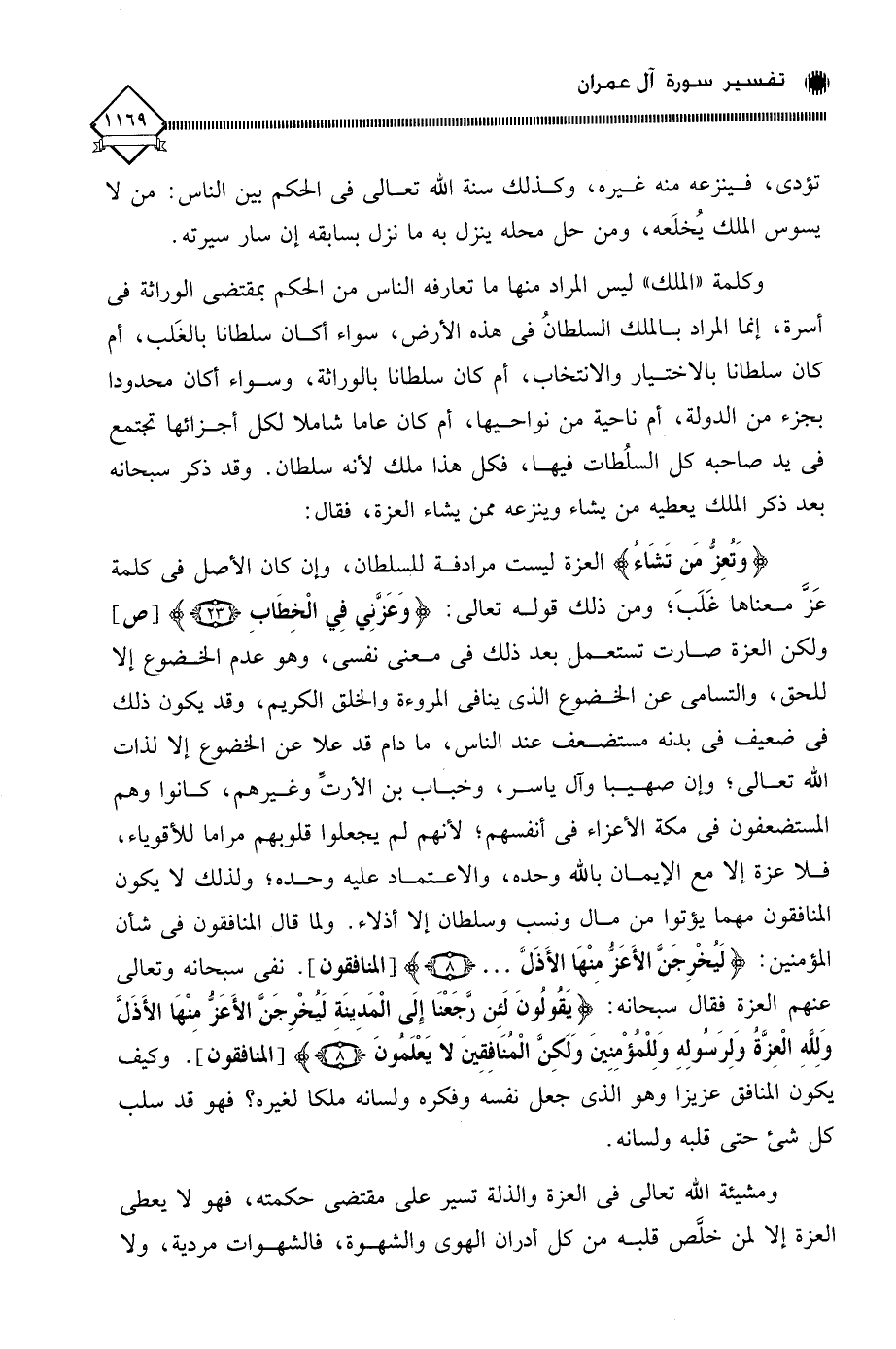 (وَتُعِزُّ مَن تَشَاءُ) العزة ليست مرادفة للسلطان، وإن كان الأصل في كلمة عَزَّ معناها غَلَبَ، ومن ذلك قوله تعالى: (وَعَزَّنِي فِي الْخِطَابِ)، ولكن العزة صارت تستعمل بعد ذلك في معنى نفسي، وهو عدم الخضوع إلا للحق، والتسامي عن الخضوع الذي ينافي المروءة والخلق الكريم، وقد يكون ذلك في ضعيف في بدنه مستضعف عند الناس، ما دام قد علا عن الخضوع إلا لذات الله تعالى، وإن صهيبا وآل ياسر، وخباب بن الأرتِّ وغيرهم، كانوا وهم المستضعفون في مكة الأعزاء في أنفسهم؛ لأنهم لم يجعلوا قلوبهم مراما للأقوياء، فلا عزة إلا مع الإيمان بالله وحده، والاعتماد عليه وحده؛ ولذلك لَا يكون المنافقون مهما يؤتوا من مال ونسب وسلطان إلا أذلاء. ولما قال المنافقون في شأن المؤمنين: (لَيُخْرِجَنَّ الأَعَزُّ منْهَا الأَذَلَّ. . .). نفَى سبحانه وتعالى عنهم العزة فقال سبحانه (يَقُولُونَ لَئِنْ رَجَعْنَا إِلَى الْمَدِينَةِ لَيُخْرِجَنَّ الْأَعَزُّ مِنْهَا الْأَذَلَّ وَلِلَّهِ الْعِزَّةُ وَلِرَسُولِهِ وَلِلْمُؤْمِنِينَ وَلَكِنَّ الْمُنَافِقِينَ لَا يَعْلَمُونَ (8).
