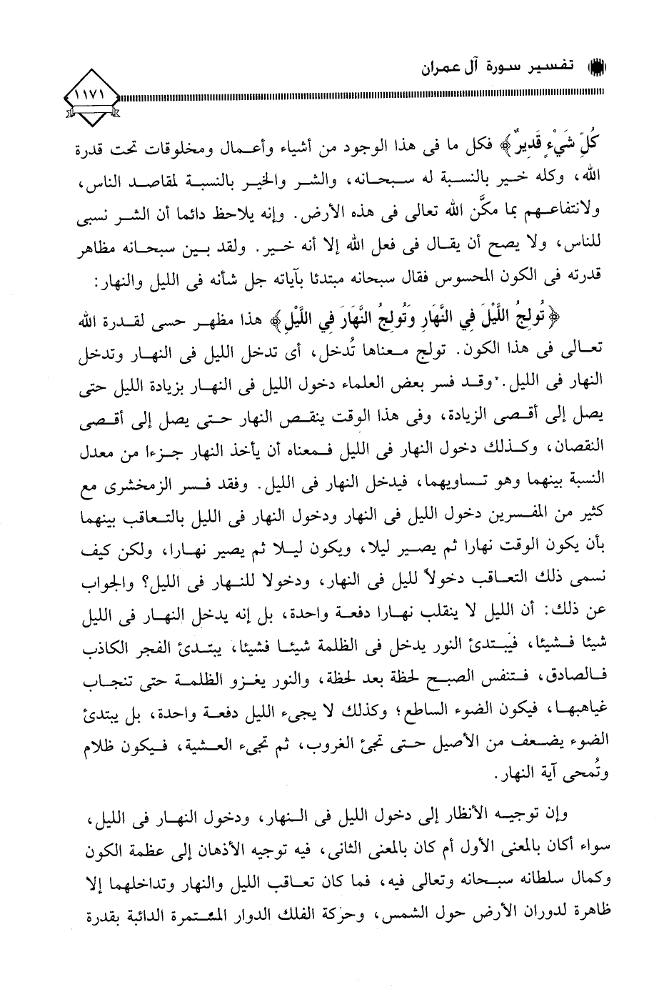 كُلِّ شَيْءٍ قَدِيرٌ) فكل ما في هذا الوجود من أشياء وأعمال ومخلوقات تحت قدرة الله، وكله خير بالنسبة له سبحانه، والشر والخير بالنسبة لمقاصد الناس، ولانتفاعهم بما مكَّن الله تعالى في هذه الأرض. وإنه يلاحظ دائما أن الشر نسبي للناس، ولا يصح أن يقال في فعل الله إلا أنه خير. ولقد بين سبحانه مظاهر قدرته في الكون المحسوس فقال سبحانه مبتدئا بآياته جل شأنه في الليل والنهار: