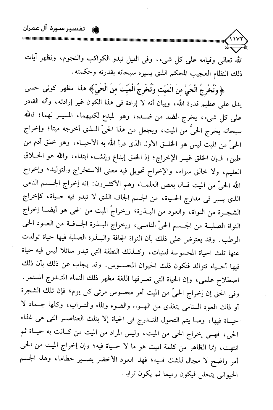وفى الحق إن إخراج الحيّ من الميت أمر محسوس مرئي كل يوم؛ فإن تلك الشجرة أو ذلك العود النامي يتغذى من الهواء والضوء والماء والتراب، وكلها جماد لا حياة فيها، وما يتم التحول المتدرج في الحياة إلا بتلك العناصر التي هي غذاء الحي، فهي إخراج الحي من الميت، وليس المراد من الميت من كانت به حياة ثم انتهت، إنما الظاهر من كلمة الميت هو ما لَا حياة فيه؛ وإن إخراج الميت من الحي أمر واضح لَا مجال للشك فيه؛ فهذا العود الأخضر يصير حطاما، وهذا الجسم الحيواني يتحلل فيكون رميما ثم يكون ترابا.