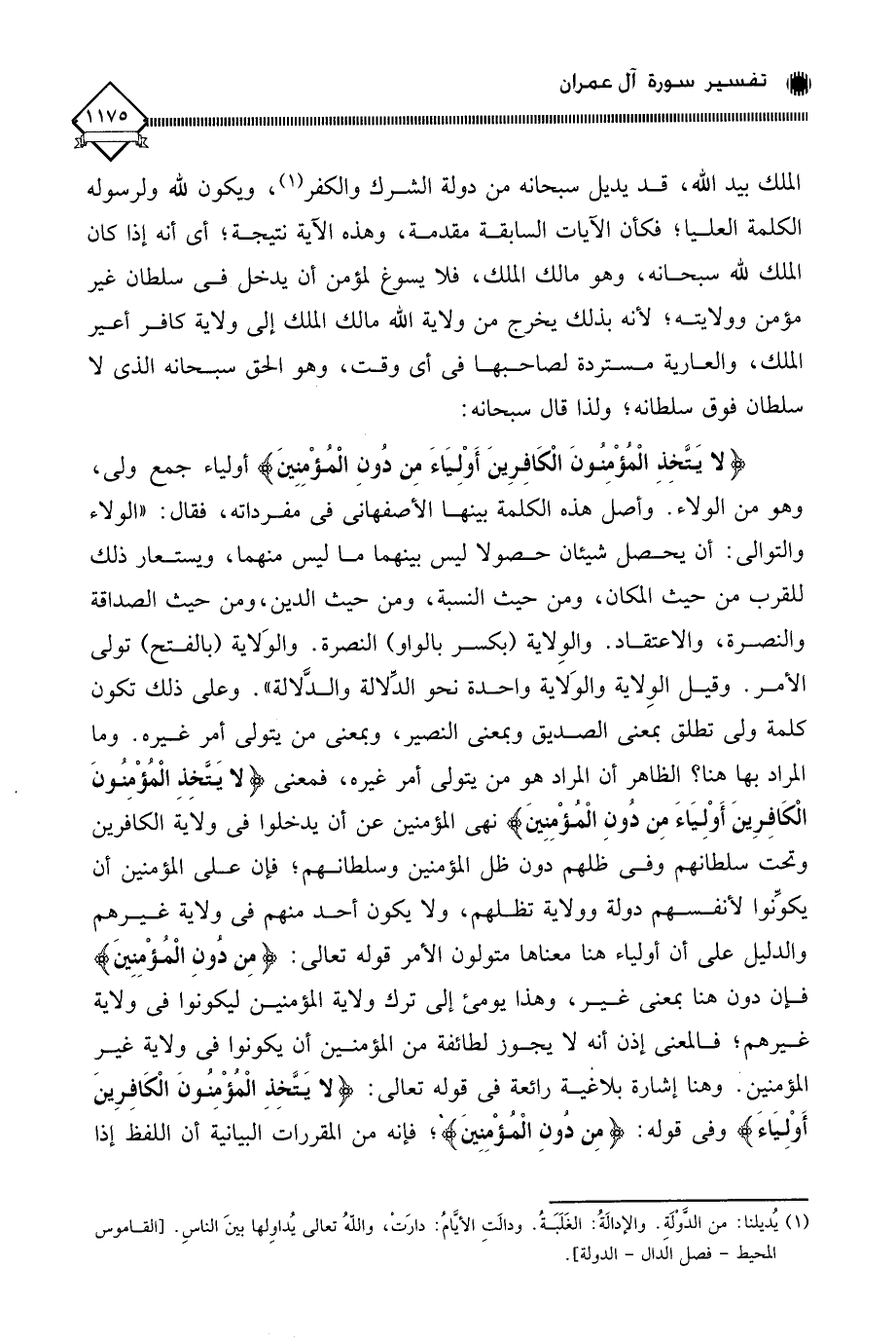 (لا يَتَّخِذِ الْمُؤْمِنُونَ الْكَافِرِينَ أَوْلِيَاءَ مِن دُونِ الْمُؤْمِنِينَ) أولياء جمع ولي، وهو من الولاء. وأصل هذه الكلمة بينها الأصفهاني في مفرداته، فقال: " الولاء والتوالي: أن يحصل شيئان حصولا ليس بينهما ما ليس منهما، ويستعار ذلك للقرب من حيث المكان، ومن حيث النسبة، ومن حيث الدين، ومن حيث الصداقة والنصرة، والاعتقاد. والوِلاية (بكسر بالواو) النصرة. والوَلاية (بالفتح) تولي الأمر. وقيل الوِلاية والوَلاية واحدة نحو الدِّلالة والدَّلالة ". وعلى ذلك تكون كلمة ولي تطلق بمعنى الصديق وبمعنى النصير، وبمعنى من يتولى أمر غيره. وما المراد بها هنا؛ الظاهر أن المراد هو من يتولى أمر غيره، فمعنى (لا يَتَّخِذِ الْمُؤْمِنُونَ الْكَافِرِينَ أَوْلِيَاءَ مِن دُونِ الْمُؤْمِنِينَ) نهى المؤمنين عن أن يدخلوا في ولاية الكافرين وتحت سلطانهم وفي ظلهم دون ظل المؤمنين وسلطانهم، فإن على المؤمنين أن يكوِّنوا لأنفسهم دولة وولاية تظلهم، ولا يكون أحد منهم في ولاية غيرهم والدليل على أن أولياء هنا معناها متولون الأمر قوله تعالى: (مِن دُونِ الْمُؤْمِنِينَ) فإن دون هنا بمعنى غير، وهذا يومئ إلى ترك ولاية المؤمنين ليكونوا في ولاية غيرهم؛ فالمعنى إذن أنه لَا يجوز لطائفة من المؤمنين أن يكونوا في ولاية غير المؤمنين. وهنا إشارة بلاغية رائعة في قوله تعالى: (لا يَتَّخِذِ الْمُؤْمِنُونَ الْكَافِرِينَ أَوْلِيَاءَ) وفي قوله: (مِن دُونِ الْمُؤْمِنِينَ)، فإنه من المقررات البيانية أن اللفظ إذا