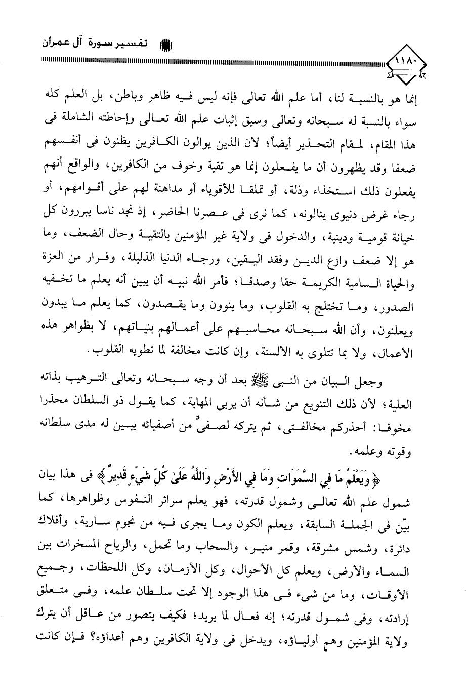 إنما هو بالنسبة لنا، أما علم الله تعالى فإنه ليس فيه ظاهر وباطن، بل العلم كله سواء بالنسبة له سبحانه وتعالى وسيق إثبات علم الله تعالى وإحاطته الشاملة في هذا المقام، لمقام التحذير أيضاً؛ لأن الذين يوالون الكافرين يظنون في أنفسهم ضعفا وقد يظهرون أن ما يفعلون إنما هو تقية وخوف من الكافرين، والواقع أنهم يفعلون ذلك استخذاء وذلة، أو تملقا للأقوياء أو مداهنة لهم على أقوامهم، أو رجاء غرض دنيوي ينالونه، كما نرى في عصرنا الحاضر، إذ نجد ناسا يبررون كل خيانة قومية ودينية، والدخول في ولاية غير المؤمنين بالتقية وحال الضعف، وما هو إلا ضعف وازع الدين وفقد اليقين، ورجاء الدنيا الذليلة، وفرار من العزة والحياة السامية الكريمة حقا وصدقا؛ فأمر الله نبيه أن يبين أنه يعلم ما تخفيه الصدور، وما تختلج به القلوب، وما ينوون وما يقصدون، كما يعلم ما يبدون ويعلنون، وأن الله سبحانه محاسبهم على أعمالهم بنياتهم، لَا بظواهر هذه الأعمال، ولا بما تتلوى به الألسنة، وإن كانت مخالفة لما تطويه القلوب. وجعل البيان من النبي - صلى الله عليه وسلم - بعد أن وجه سبحانه وتعالى الترهيب بذاته العلية؛ لأن ذلك التنويع من شأنه أن يربي المهابة، كما يقول ذو السلطان محذرا مخوفا: أحذركم مخالفتى، ثم يتركه لصفي من أصفيائه يبين له مدى سلطانه وقوته وعلمه.