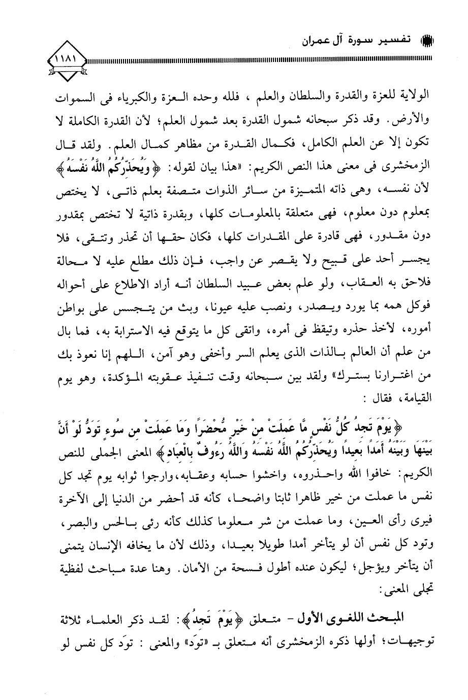 الولاية للعزة والقدرة والسلطان والعلم، فلله وحده العزة والكبرياء في السماوات والأرض. وقد ذكر سبحانه شمول القدرة بعد شمول العلم؛ لأن القدرة الكاملة لا تكون إلا عن العلم الكامل، فكمال القدرة من مظاهر كمال العلم. ولقد قال الزمخشري في معنى هذا النص الكريم: " هذا بيان لقوله: (وَيُحَذِّرُكُمُ اللَّهُ نَفْسَهُ) لأن نفسه، وهي ذاته المتميزة من سائر الذوات متصفة بعلم ذاتي، لَا يختص بمعلوم دون معلوم، فهي متعلقة بالمعلومات كلها، وبقدرة ذاتية لَا تختص بمقدور دون مقدور، فهي قادرة على المقدرات كلها، فكان حقها أن تحذر وتتقى، فلا يجسر أحد على قبيح ولا يقصر عن واجب، فإن ذلك مطلع عليه لَا محالة فلاحق به العقاب، ولو علم بعض عبيد السلطان أنه أراد الاطلاع على أحواله فوكل همه بما يورد ويصدر، ونصب عليه عيونا، وبث من يتجسس على بواطن أموره، لأخذ حذره وتيقظ في أمره، واتقى كل ما يتوقع فيه الاسترابة به، فما بال من علم أن العالم بالذات الذي يعلم السر وأخفى وهو آمن، اللهم إنا نعوذ بك من اغترارنا بسترك؛ ولقد بين سبحانه وقت تنفيذ عقوبته المؤكدة، وهو يوم القيامة، فقال: