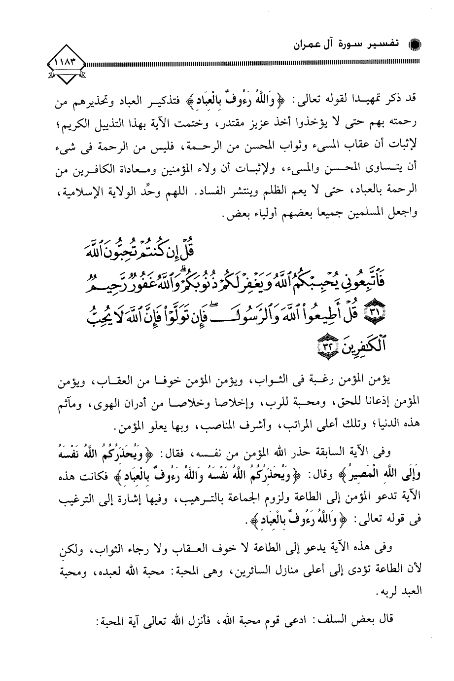 (قُلْ إِنْ كُنْتُمْ تُحِبُّونَ اللَّهَ فَاتَّبِعُونِي يُحْبِبْكُمُ اللَّهُ وَيَغْفِرْ لَكُمْ ذُنُوبَكُمْ وَاللَّهُ غَفُورٌ رَحِيمٌ (31) قُلْ أَطِيعُوا اللَّهَ وَالرَّسُولَ فَإِنْ تَوَلَّوْا فَإِنَّ اللَّهَ لَا يُحِبُّ الْكَافِرِينَ (32)
