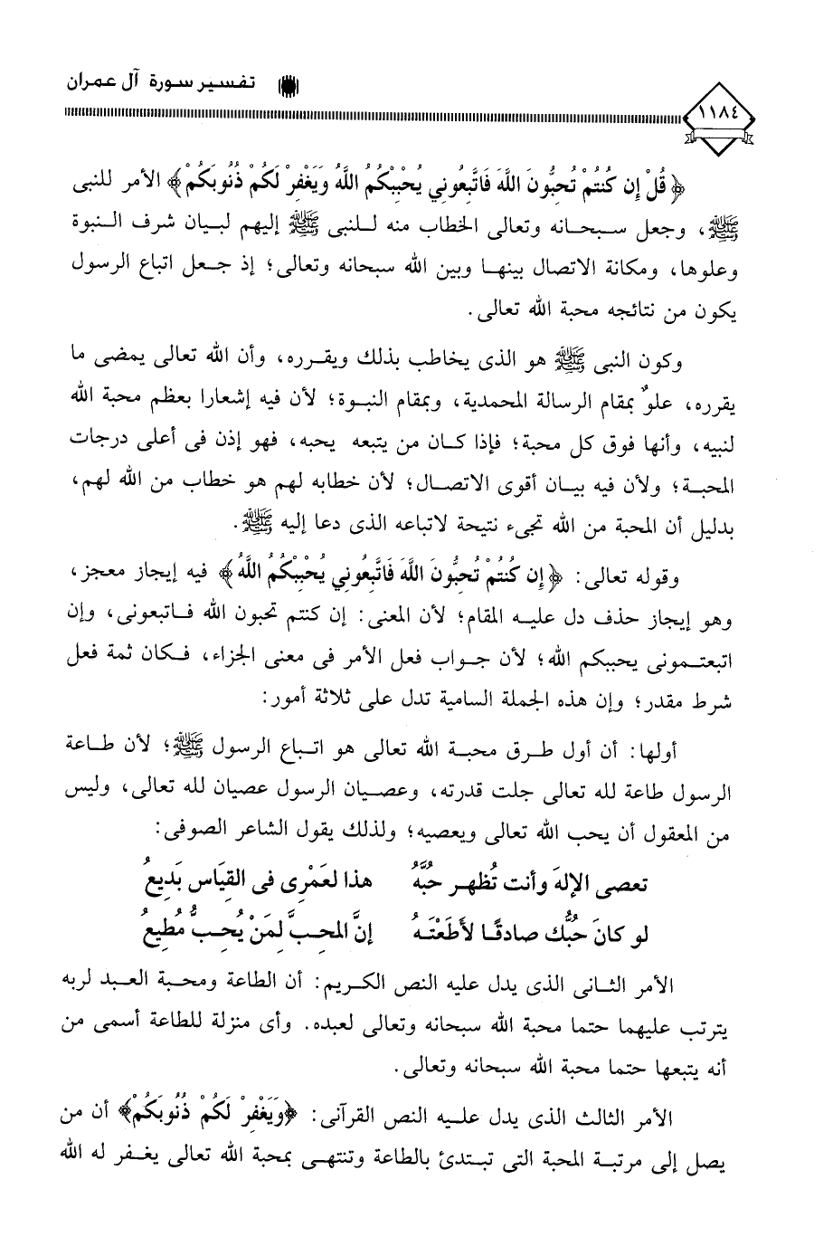 وقوله تعالى: (إِن كُنتُمْ تُحِبُّونَ اللَّهَ فَاتَّبِعُونِي يُحْبِبْكُمُ اللَّهُ) فيه إيجاز معجز، وهو إيجاز حذف دل عليه المقام؛ لأن المعنى: إن كنتم تحبون الله فاتبعوني، وإن اتبعتموني يحببكم الله؛ لأن جواب فعل الأمر في معنى الجزاء، فكان ثمة فعل شرط مقدر، وإن هذه الجملة السامية تدل على ثلاثة أمور: