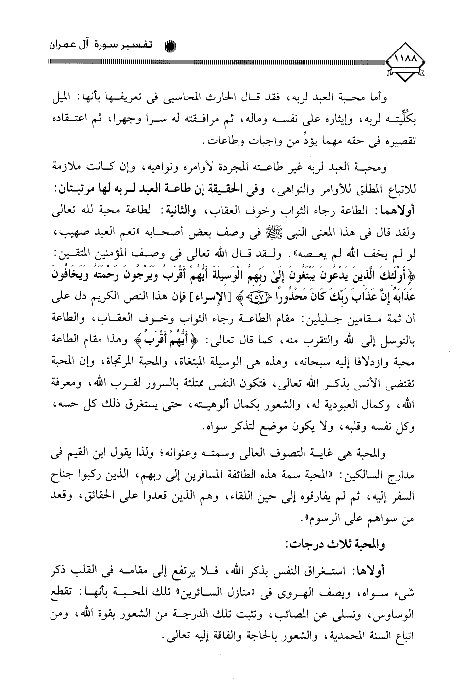 ومحبة العبد لربه غير طاعته المجردة لأوامره ونواهيه، وإن كانت ملازمة للاتباع المطلق للأوامر والنواهي، وفي الحقيقة إن طاعة العبد لربه لها مرتبتان: أولاهما: الطاعة رجاء الثواب وخوف العقاب، والثانية: الطاعة محبة لله تعالى ولقد قال في هذا المعنى النبي - صلى الله عليه وسلم - في وصف بعض أصحابه " نعم العبد صهيب، لو لم يخف الله لم يعصه ". ولقد قال الله تعالى في وصف المؤمنين المتقين: (أُولَئِكَ الَّذِينَ يَدْعُونَ يَبْتَغُونَ إِلَى رَبِّهِمُ الْوَسِيلَةَ أَيُّهُمْ أَقْرَبُ وَيَرْجُونَ رَحْمَتَهُ وَيَخَافُونَ عَذَابَهُ إِنَّ عَذَابَ رَبِّكَ كَانَ مَحْذُورًا)، فإن هذا النص الكريم دل على أن ثمة مقامين جليلين: مقام الطاعة رجاء الثواب وخوف العقاب، والطاعة بالتوسل إلى الله والتقرب منه، كما قال تعالى: (أَيُّهُمْ أَقْرَبُ) وهذا مقام الطاعة محبة وازدلافا إليه سبحانه، وهذه هي الوسيلة المبتغاة، والمحبة المرتجاة، وإن المحبة تقتضي الأنس بذكر الله تعالى، فتكون النفس ممتلئة بالسرور لقرب الله، ومعرفة الله، وكمال العبودية له، والشعور بكمال ألوهيته، حتى يستغرق ذلك كل حسه، وكل نفسه وقلبه، ولا يكون موضع لتذكر سواه.