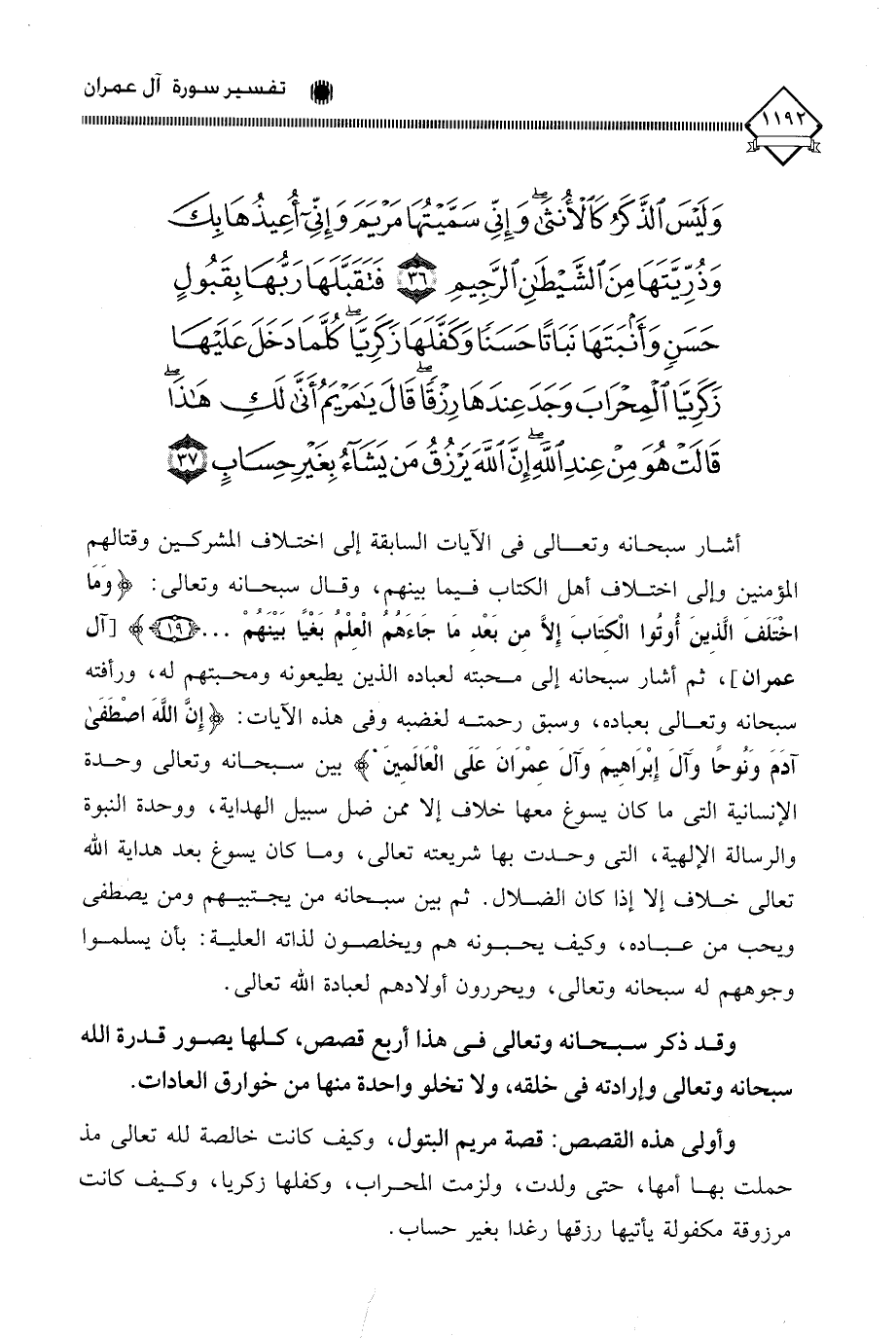 وَلَيْسَ الذَّكَرُ كَالْأُنْثَى وَإِنِّي سَمَّيْتُهَا مَرْيَمَ وَإِنِّي أُعِيذُهَا بِكَ وَذُرِّيَّتَهَا مِنَ الشَّيْطَانِ الرَّجِيمِ (36) فَتَقَبَّلَهَا رَبُّهَا بِقَبُولٍ حَسَنٍ وَأَنْبَتَهَا نَبَاتًا حَسَنًا وَكَفَّلَهَا زَكَرِيَّا كُلَّمَا دَخَلَ عَلَيْهَا زَكَرِيَّا الْمِحْرَابَ وَجَدَ عِنْدَهَا رِزْقًا قَالَ يَا مَرْيَمُ أَنَّى لَكِ هَذَا قَالَتْ هُوَ مِنْ عِنْدِ اللَّهِ إِنَّ اللَّهَ يَرْزُقُ مَنْ يَشَاءُ بِغَيْرِ حِسَابٍ (37)