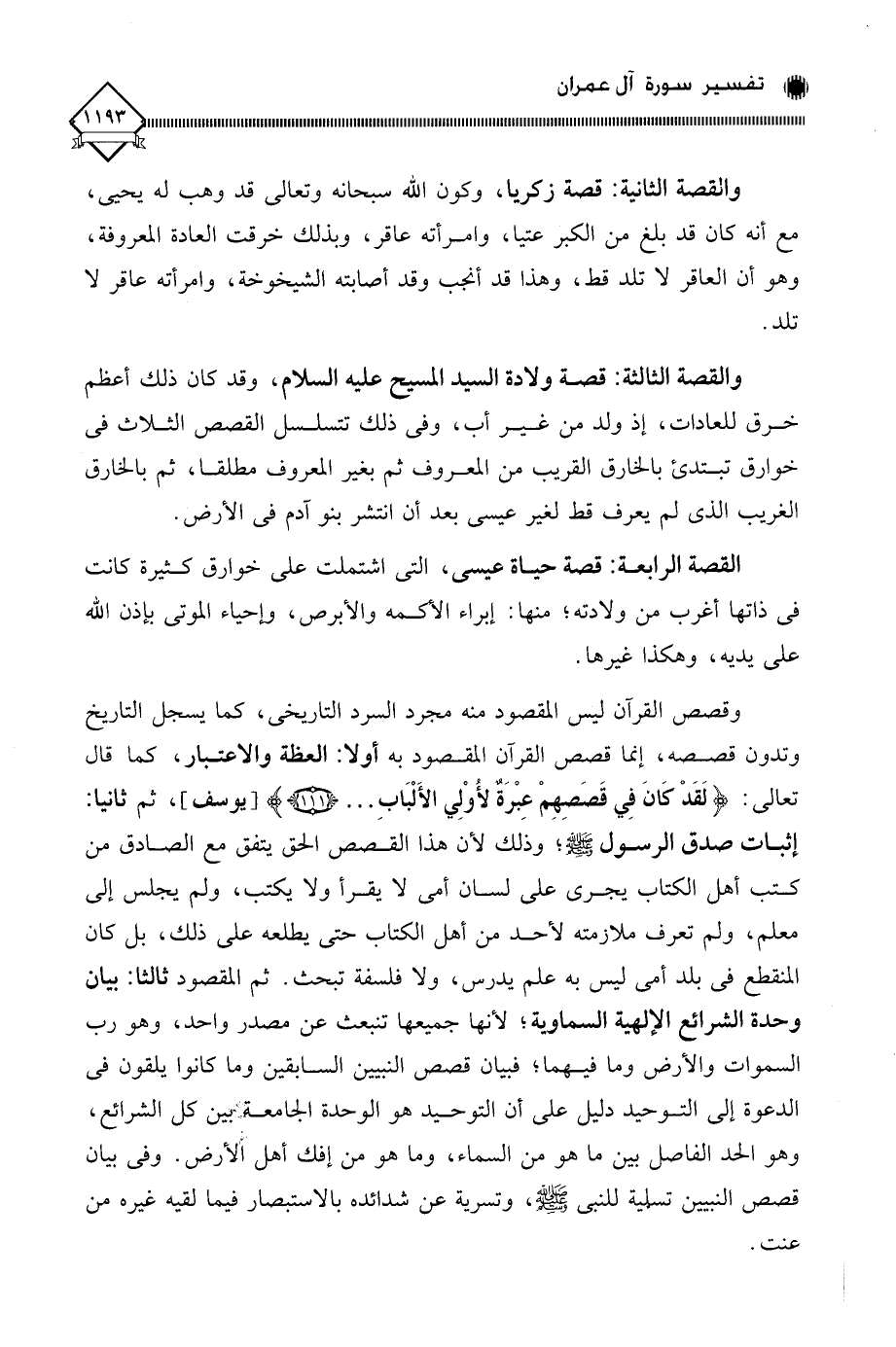 والقصة الثالثة: قصة ولادة السيد المسيح عليه السلام، وقد كان ذلك أعظم خرق للعادات، إذ ولد من غير أب، وفي ذلك تتسلسل القصص الثلاث في خوارق تبتدئ بالخارق القريب من المعروف ثم بغير المعروف مطلقا، ثم بالخارق الغريب الذي لم يعرف قط لغير عيسى بعد أن انتشر بنو آدم في الأرض. القصة الرابعة: قصة حياة عيسى، التي اشتملت على خوارق كثيرة كانت في ذاتها أغرب من ولادته؛ منها: إبراء الأكمه والأبرص، وإحياء الموتى بإذن الله على يديه، وهكذا غيرها.