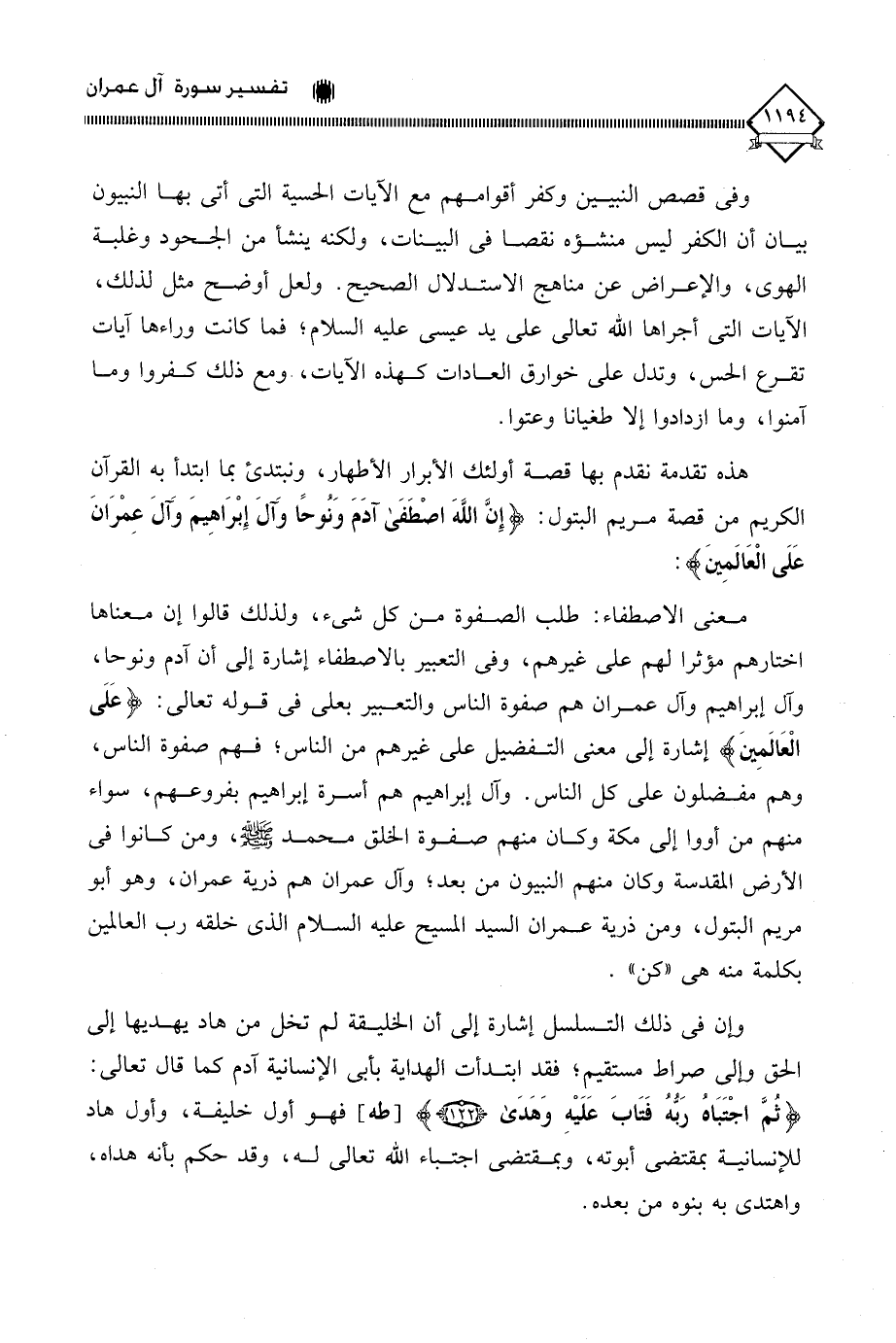 معنى الاصطفاء: طلب الصفوة من كل شيء، ولذلك قالوا إن معناها اختارهم مؤثرا لهم على غيرهم، وفي التعبير بالاصطفاء إشارة إلى أن آدم ونوحا، وآل إبراهيم وآل عمران هم صفوة الناس والتعبير بعلى في قوله تعالى: (عَلَى الْعَالَمِينَ) إشارة إلى معنى التفضيل على غيرهم من الناس؛ فهم صفوة الناس، وهم مفضلون على كل الناس. وآل إبراهيم هم أسرة إبراهيم بفروعهم، سواء منهم من أووا إلى مكة وكان منهم صفوة الخلق محمد - صلى الله عليه وسلم -، ومن كانوا في الأرض المقدسة وكان منهم النبيون من بعد، وآل عمران هم ذرية عمران، وهو أبو مريم البتول، ومن ذرية عمران السيد المسيح عليه السلام الذي خلقه رب العالمين بكلمة منه هي " كن ".