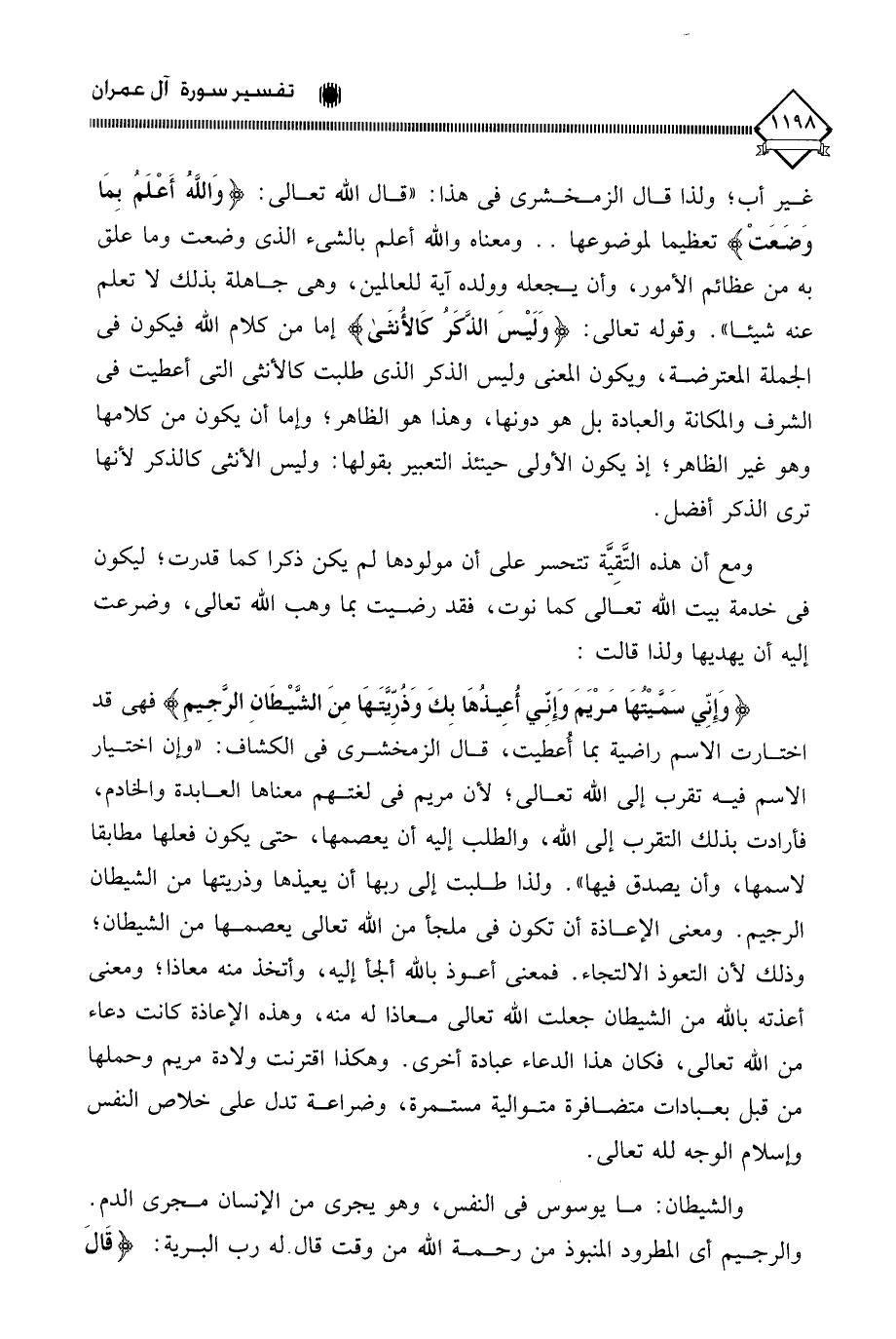 غير أب، ولذا قال الزمخشري في هذا قال الله تعالى (وَاللَّهُ أَعْلَمُ بِمَا وَضَعَتْ) تعظيما لموضوعها. . ومعناه والله أعلم بالشيء الذي وضعت وما علق به من عظائم الأمور، وأن يجعله وولده آية للعالين، وهي جاهلة بذلك لَا تعلم عنه شيئا ". وقوله تعالى: (وَلَيْسَ الذَّكَرُ كَالْأُنْثَى) إما من كلام الله فيكون في الجملة المعترضة، ويكون المعنى وليس الذكر الذي طلبت كالأنثى التي أعطيت في الشرف والمكانة والعبادة بل هو دونها، وهذا هو الظاهر، وإما أن يكون من كلامها وهو غير الظاهر، إذ يكون الأولى حينئذ التعبير بقولها: وليس الأنثى كالذكر لأنها ترى الذكر أفضل.