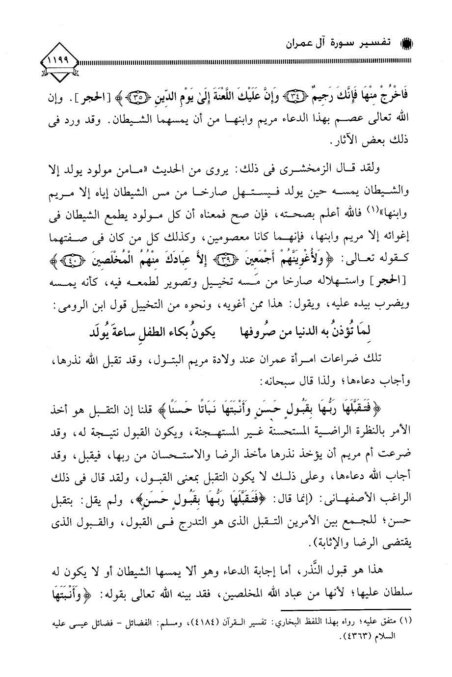 ، واستهلاله صارخا من مَسه تخييل وتصوير لطمعه فيه، كأنه يمسه ويضرب بيده عليه، ويقول: هذا ممن أغويه، ونحوه من التخييل قول ابن الرومي: لِمَا تُؤذنُ به الدنيا من صُروفها ... يكونُ بكاء الطفلِ ساعةَ يُولَد تلك ضراعات امرأة عمران عند ولادة مريم البتول، وقد تقبل الله نذرها، وأجاب دعاءها؛ ولذا قال سبحانه: