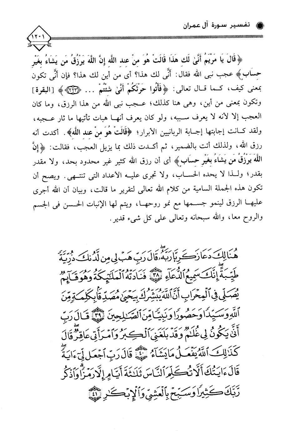 (قَالَ يَا مَرْيَمُ أَنَّى لَكِ هَذَا قَالَتْ هُوَ مِنْ عِنْدِ اللَّهِ إِنَّ اللَّهَ يَرْزُقُ مَنْ يَشَاءُ بِغَيْرِ حِسَابٍ) عجب نبي الله فقال: أَنَى لك هذا؟ أي من أَين لك هذا؟ فإن أَنَّى تكون بمعنى كيف، كما قال تعالى: (فَأتُوا حَرْثَكُمْ أَنَّى شِئْتُمْ. . .)، وتكون بمعنى من أين، وهي هنا كذلك؛ عجب نبي الله من هذا الرزق، وما كان العجب إلا لأنه لَا يعرف لسببه، ولو كان يعرف أنها هبات تأتيها ما ثار عجبه، ولقد كانت إجابتها إجابة الربانيين الأبرار؛ (قَالَتْ هُوَ مِنْ عِندِ اللَّهِ). أكدت أنه رزق الله، ولذلك أتت بالضمير، ثم أكدت ذلك بما يزيل العجب، فقالت: (إِنَّ اللَّهَ يَرْزُقً مَن يَشَاءُ بِغَيْرِ حِسَابٍ) أي أن رزق الله كثير غير محدود بحد، ولا مقدر بقدر؛ ولذا لَا يحده الحساب، ولا تجري عليه الأعداد التي تنتهي. ويصح أن تكون هذه الجملة السامية من كلام الله تعالى لتقرير ما قالت، وبيان أن الله أجرى عليها الرزق لينمو جسمها مع نمو روحها، ويتم لها الإنبات الحسن في الجسم والروح معا، والله سبحانه وتعالى على كل شيء قدير.