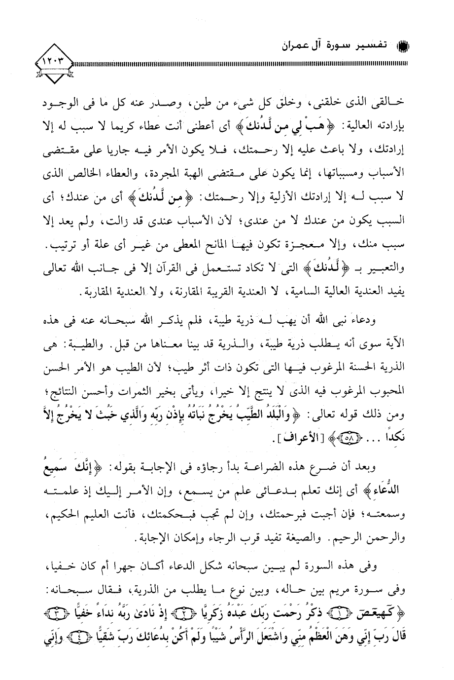 خالقي الذي خلقني، وخلق كل شيء من طين، وصدر عنه كل ما في الوجود بإرادته العالية: (هَبْ لِي مِن لَّدُنكَ) أي أعطني أنت عطاء كريما لَا سبب له إلا إرادتك، ولا باعث عليه إلا رحمتك، فلا يكون الأمر فيه جاريا على مقتضى الأسباب ومسبباتها، إنما يكون على مقتضى الهبة المجردة، والعطاء الخالص الذي لا سبب له إلا إرادتك الأزلية وإلا رحمتك: (مِن لَّدُنكَ) أي من عندك، أي السبب يكون من عندك لَا من عندي، لأن الأسباب عندي قد زالت، ولم يعد إلا سبب منك، وإلا معجزة تكون فيها المانح المعطي من غير أي علة أو ترتيب.