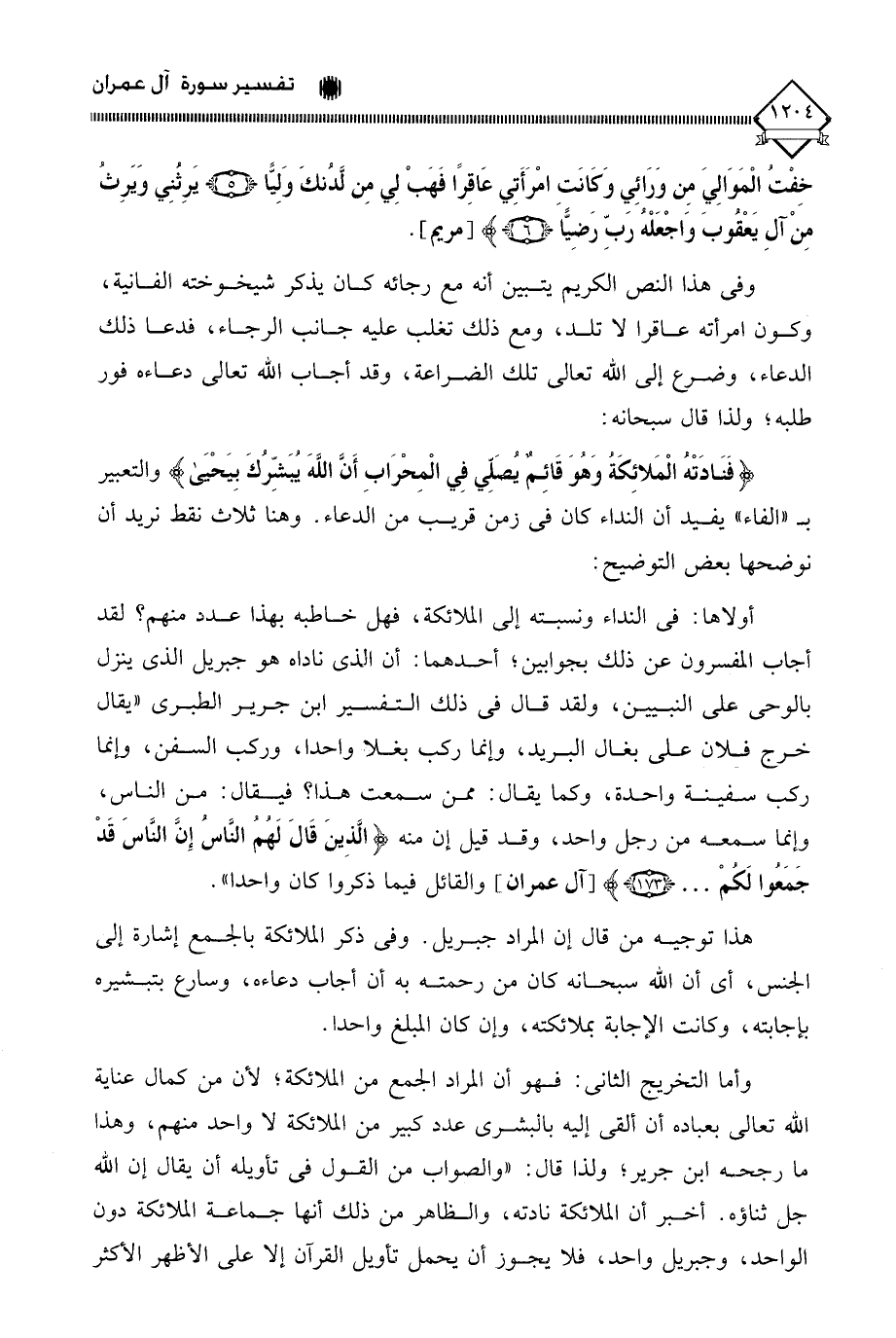وأما التخريج الثاني: فهو أن المراد الجمع من الملائكة؛ لأن من كمال عناية الله تعالى بعباده أن ألقى إليه بالبشرى عدد كبير من الملائكة لَا واحد منهم، وهذا ما رجحه ابن جرير، ولذا قال: " والصواب من القول في تأويله أن يقال إن الله جل ثناؤه. أخبر أن الملائكة نادته، والظاهر من ذلك أن جماعة الملائكة دون الواحد، وجبريل واحد، فلا يجوز أن يحمل تأويل القرآن إلا على الأظهر الأكثر
