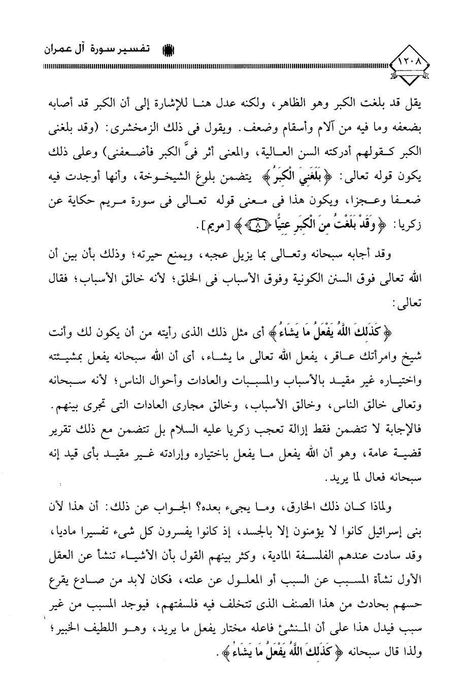 (كَذَلِكَ اللَّهُ يَفْعَلُ مَا يَشَاءُ) أي مثل ذلك الذي رأيته من أن يكون لك وأنت شيخ وامرأتك عاقر، يفعل الله تعالى ما يشاء، أي أن الله سبحانه يفعل بمشيئته واختياره غير مقيد بالأسباب والمسببات والعادات وأحوال الناس؛ لأنه سبحانه وتعالى خالق الناس، وخالق الأسباب، وخالق مجارى العادات التي تجري بينهم. فالإجابة لَا تتضمن فقط إزالة تعجب زكريا عليه السلام بل تتضمن مع ذلك تقرير قضية عامة، وهو أن الله يفعل ما يفعل باختياره وإرادته غير مقيد بأي قيد إنه سبحانه فعال لما يريد.