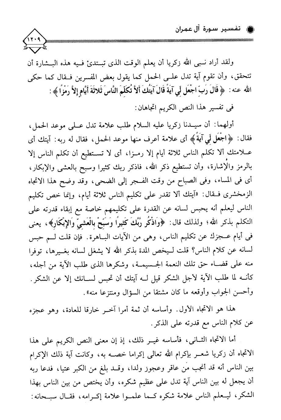 أولهما: أن سيدنا زكريا عليه السلام طلب علامة تدل على موعد الحمل، فقال: (اجْعَل لِّي آيَةً) أي علامة أعرف منها موعد الحمل، فقال له ربه: آيتك أي علامتك ألا تكلم الناس ثلاثة أيام إلا رمزا، أي لَا تستطيع أن تكلم الناس إلا بالرمز والإشارة، وأن تستطيع ذكر الله، فاذكر ربك كثيرا وسبح بالعشي والإبكار، أي في المساء، وفي الصباح من وقت الفجر إلى الضحى، وقد وضح هذا الاتجاه الزمخشري فقال: " آيتك ألا تقدر على تكليم الناس ثلاثة أيام، وإنما خص تكليم الناس ليعلم أنه يحبس لسانه عن القدرة على تكليمهم خاصة مع إبقاء قدرته على التكلم بذكر الله؛ ولذلك قال: (وَاذْكُرْ رَبَّكَ كَثِيرًا وَسَبِّحْ بِالْعَشِيِّ وَالْإِبْكَارِ)، يعني في أيام عجزك عن تكليم الناس، وهي من الآيات الباهرة. فإن قلت لم حبس لسانه عن كلام الناس؟ قلت ليخص المدة بذكر الله لَا يشغل لسانه بغيرها، توفرا منه على قضاء حق تلك النعمة الجسيمة، وشكرها الذي طلب الآية من أجله، كأنه لما طلب الآية لأجل الشكر قيل له آيتك أن تحبس لسانك إلا عن الشكر.