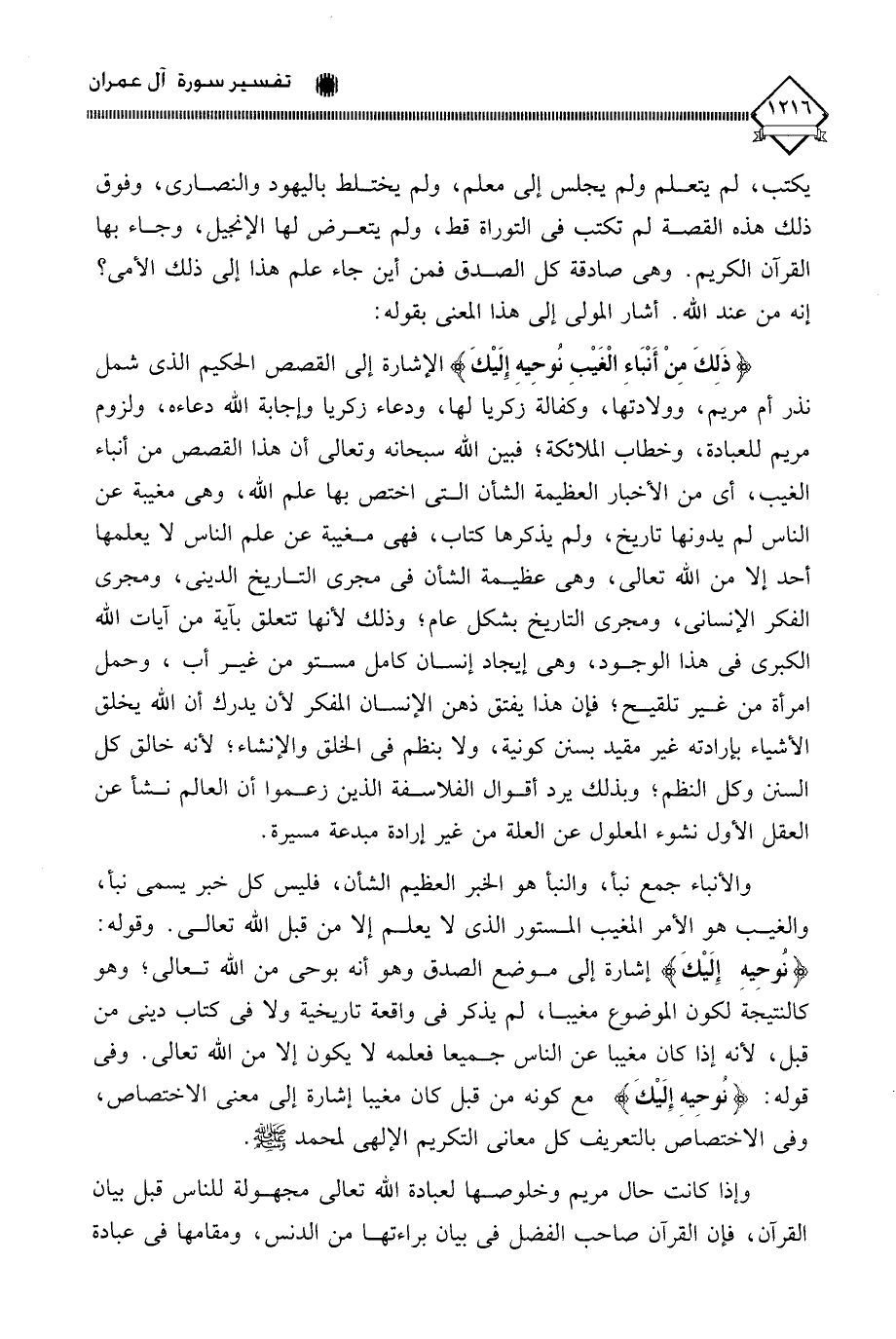 (ذَلِكَ مِنْ أَنْبَاءِ الْغَيْبِ نوحِيه إِلَيْكَ) الإشارة إلى القصص الحكيم الذي شمل نذر أم مريم، وولادتها، وكفالة زَكريا لها، ودعاء زكريا وإجابة الله دعاءه، ولزوم مريم للعبادة، وخطاب الملائكة؛ فبين الله سبحانه وتعالى أن هذا القصص من أنباء الغيب، أي من الأخبار العظيمة الشأن التي اختص بها علم الله، وهي مغيبة عن الناس لم يدونها تاريخ، ولم يذكرها كتاب، فهي مغيبة عن علم الناس لَا يعلمها أحد إلا من الله تعالى، وهي عظيمة الشأن في مجرى التاريخ الديني، ومجرى الفكر الإنساني، ومجرى التاريخ بشكل عام؛ وذلك لأنها تتعلق بآية من آيات الله الكبرى في هذا الوجود، وهي إيجاد إنسان كامل مستو من غير أب، وحمل امرأة من غير تلقيح؛ فإن هذا يفتق ذهن الإنسان المفكر لأن يدرك أن الله يخلق الأشياء بإرادته غير مقيد بسنن كونية، ولا بنظم في الخلق والإنشاء؛ لأنه خالق كل السنن وكل النظم؛ وبذلك يرد أقوال الفلاسفة الذين زعموا أن العالم نشأ عن العقل الأول نشوء المعلول عن العلة من غير إرادة مبدعة مسيرة.
