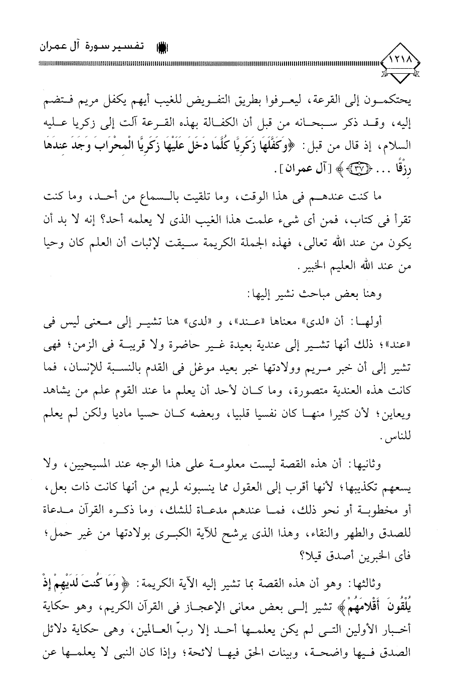 وثالثها: وهو أن هذه القصة بما تشير إليه الآية الكريمة: (وَمَا كُنتَ لَدَيْهِمْ إِذْ يُلْقُونَ أَقْلامَهُمْ) تشير إلى بعض معاني الإعجاز في القرآن الكريم، وهو حكاية أخبار الأولين التي لم يكن يعلمها أحد إلا ربُّ العالمين، وهي حكاية دلائل الصدق فيها واضحة، وبينات الحق فيها لائحة، وإذا كان النبي لَا يعلمها عن