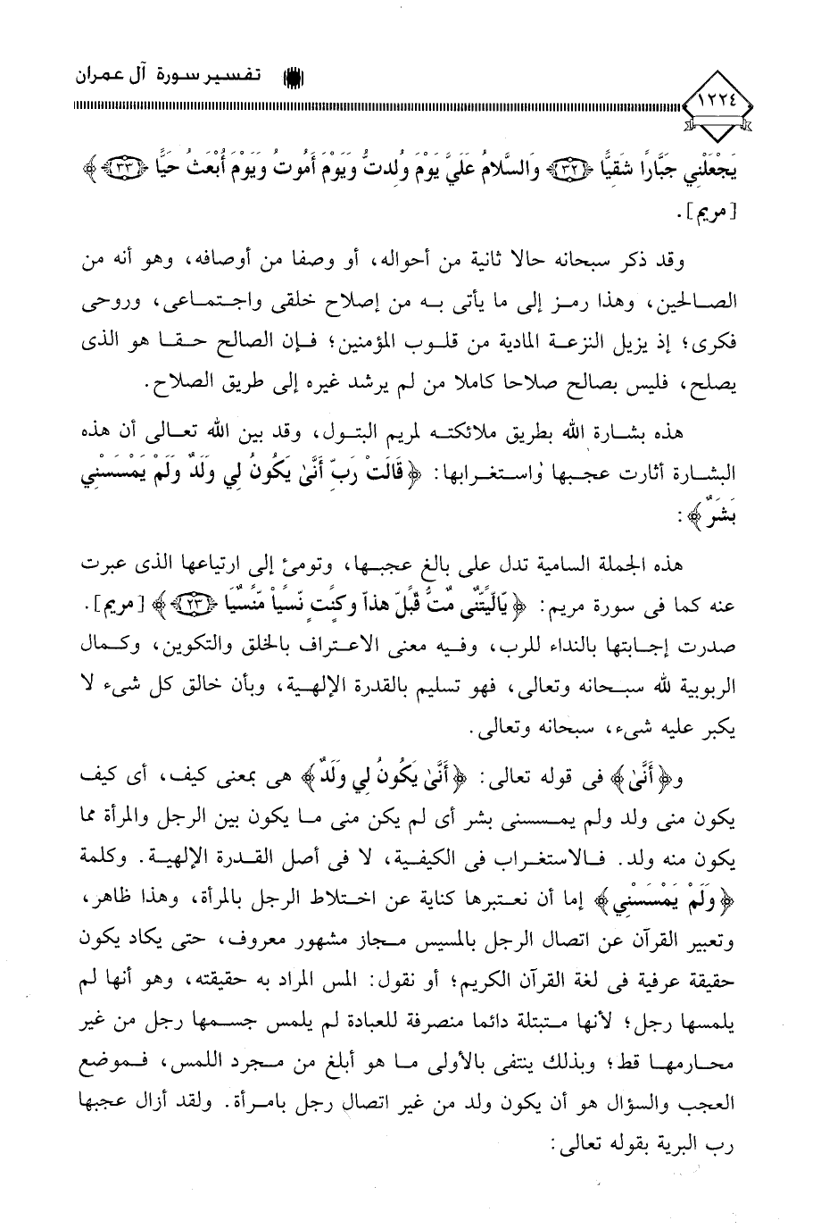 وقد ذكر سبحانه حالا ثانية من أحواله، أو وصفا من أوصافه، وهو أنه من الصالحين، وهذا رمز إلى ما يأتي به من إصلاح خلقي واجتماعي، وروحي فكري؛ إذ يزيل النزعة المادية من قلوب المؤمنين؛ فإن الصالح حقا هو الذي يصلح، فليس بصالح صلاحا كاملا من لم يرشد غيره إلى طريق الصلاح. هذه بشارة الله بطريق ملائكته لمريم البتول، وقد بين الله تعالى أن هذه البشارة أثارت عجبها واستغرابها: