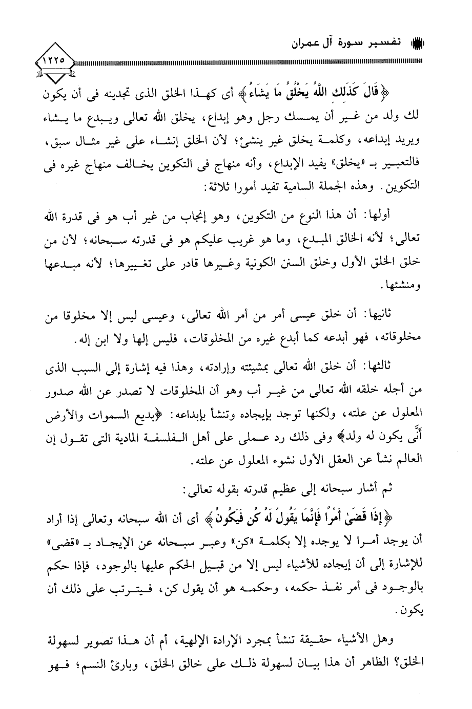 ثالثها: أن خلق الله تعالى بمشيئته وإرادته، وهذا فيه إشارة إلى السبب الذي من أجله خلقه الله تعالى من غير أب وهو أن المخلوقات لَا تصدر عن الله صدور المعلول عن علته، ولكنها توجد بإيجاده وتنشأ بإبداعه: (بديع السماوات والأرض أَنَى يكون له ولد) وفي ذلك رد عملي على أهل الفلسفة المادية التي تقول إن العالم نشأ عن العقل الأول نشوء المعلول عن علته.