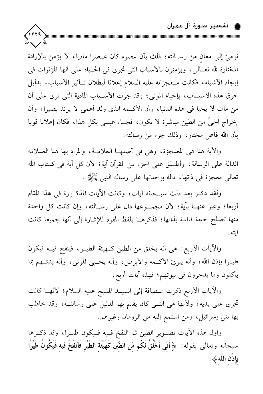 وأول هذه الآيات تصوير الطين ثم النفخ فيه فيكون طيرا، وقد ذكرها سبحانه وتعالى بقوله: (أَنِّي أَخْلُقُ لَكُمْ مِنَ الطِّينِ كَهَيْئَةِ الطَّيْرِ فَأَنْفُخُ فِيهِ فَيَكُونُ طَيْرًا بِإِذْنِ اللَّهِ):