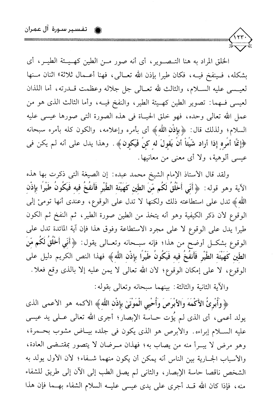 ولقد قال الأستاذ الإمام الشيخ محمد عبده: إن الصيغة التي ذكرت بها هذه الآية وهو قوله: (أَنِّي أَخْلُقُ لَكُم مِّنَ الطِّينِ كَهَيْئَةِ الطَّيْرِ فَأَنفخ فِيهِ فَيَكون طَيْرًا بِإِذْنِ اللَّهِ) تدل على استطاعته ذلك ولكنها لَا تدل على الوقوع، وعندي أنها تومئ إلى الوقوع لأن ذكر الكيفية وهو أنه يتخذ من الطين صورة الطير، ثم النفخ ثم الكون طيرا يدل على الوقوع لَا على مجرد الاستطاعة وفوق هذا فإن آية المائدة تدل على الوقوع بشكل أوضح من هذا؛ فإنه سبحانه وتعالى يقول: (أَنِّي أَخْلُقُ لَكُم مِّن الطِّينِ كَهَيْئَةِ الطَّيْرِ فَأَنفخُ فِيهِ فَيَكُون طَيْرًا بِإِذْنِ اللَّهِ) فهذا النص الكريم دليل على الوقوع، لَا على إمكان الوقوع؛ لأن الله تعالى لَا يمن عليه إلا بالذي وقع فعلا.