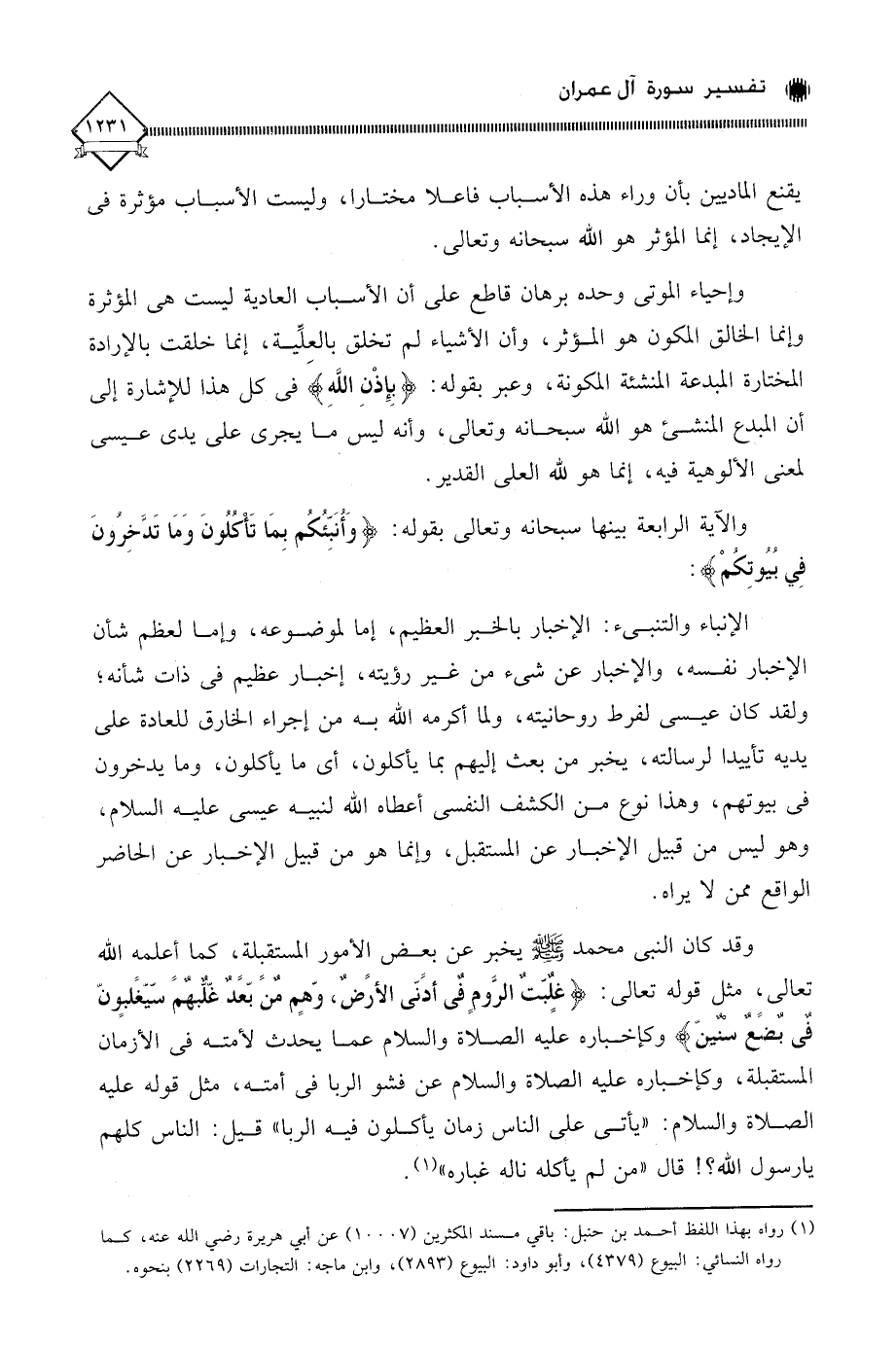 وإحياء الموتى وحده برهان قاطع على أن الأسباب العادية ليست هي المؤثرة وإنما الخالق المكون هو المؤثر، وأن الأشياء لم تخلق بالعلِّية، إنما خلقت بالإرادة المختارة المبدعة المنشئة المكونة، وعبر بقوله: (بِإِذْنِ اللَّهِ) في كل هذا للإشارة إلى أن المبدع المنشئ هو الله سبحانه وتعالى، وأنه ليس ما يجري على يدي عيسى لمعنى الألوهية فيه، إنما هو لله العلي القدير.