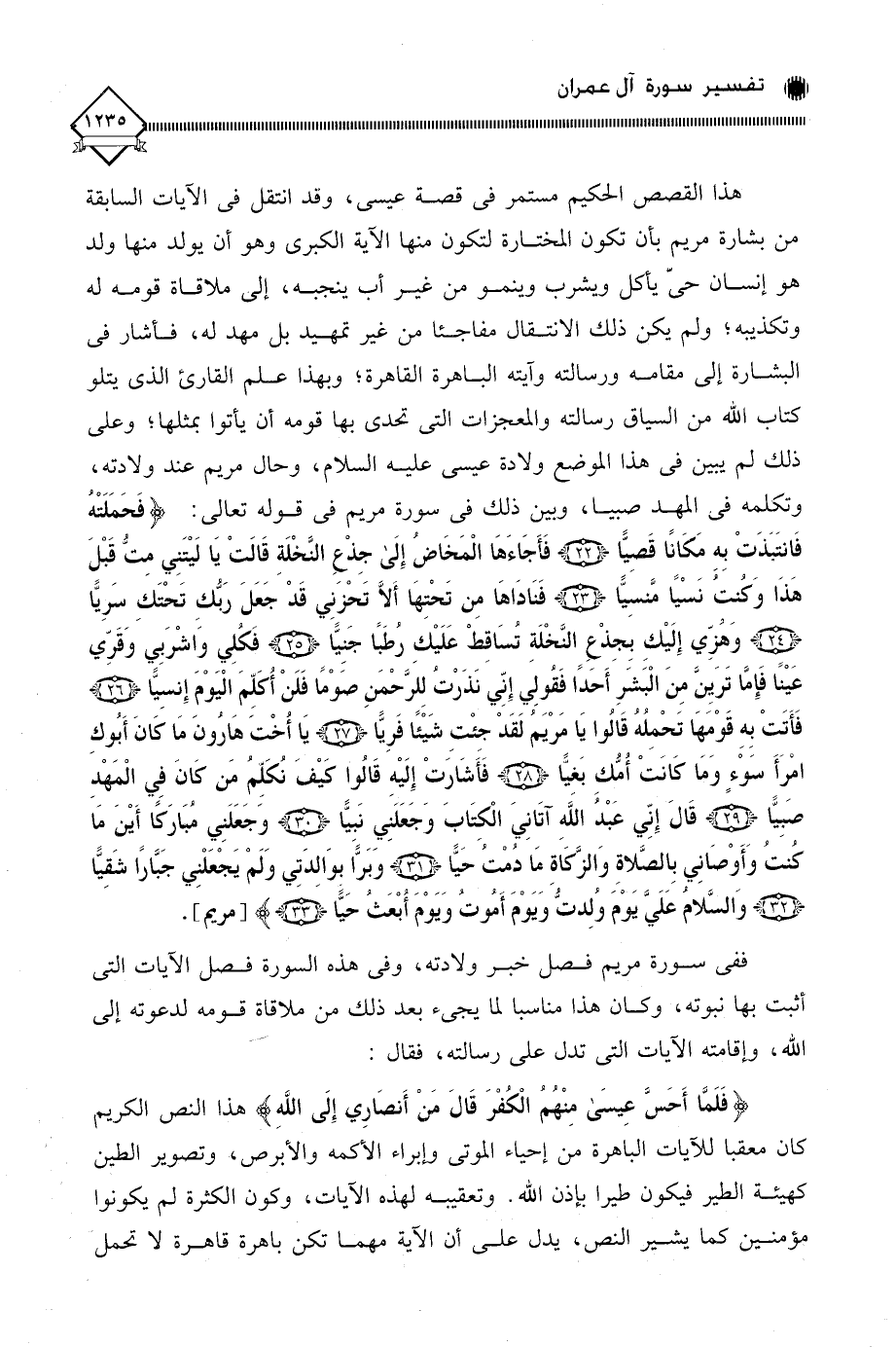 هذا القصص الحكيم مستمر في قصة عيسى، وقد انتقل في الآيات السابقة من بشارة مريم بأن تكون المختارة لتكون منها الآية الكبرى وهو أن يولد منها ولد هو إنسان حيّ يأكل ويشرب وينمو من غير أب ينجبه، إلى ملاقاة قومه له وتكذيبه؛ ولم يكن ذلك الانتقال مفاجئا من غير تمهيد بل مهد له، فأشار في البشارة إلى مقامه ورسالته وآيته الباهرة القاهرة؛ وبهذا علم القارئ الذي يتلو كتاب الله من السياق رسالته والمعجزات التي تحدى بها قومه أن يأتوا بمثلها؛ وعلى ذلك لم يمين في هذا الموضع ولادة عيسى عليه السلام، وحال مريم عند ولادته، وتعَلمه في المهد صبيا، وبين ذلك في سورة مريم في قوله تعالى: (فَحَمَلَتْهُ فَانْتَبَذَتْ بِهِ مَكَانًا قَصِيًّا (22) فَأَجَاءَهَا الْمَخَاضُ إِلَى جِذْعِ النَّخْلَةِ قَالَتْ يَا لَيْتَنِي مِتُّ قَبْلَ هَذَا وَكُنْتُ نَسْيًا مَنْسِيًّا (23) فَنَادَاهَا مِنْ تَحْتِهَا أَلَّا تَحْزَنِي قَدْ جَعَلَ رَبُّكِ تَحْتَكِ سَرِيًّا (24) وَهُزِّي إِلَيْكِ بِجِذْعِ النَّخْلَةِ تُسَاقِطْ عَلَيْكِ رُطَبًا جَنِيًّا (25) فَكُلِي وَاشْرَبِي وَقَرِّي عَيْنًا فَإِمَّا تَرَيِنَّ مِنَ الْبَشَرِ أَحَدًا فَقُولِي إِنِّي نَذَرْتُ لِلرَّحْمَنِ صَوْمًا فَلَنْ أُكَلِّمَ الْيَوْمَ إِنْسِيًّا (26) فَأَتَتْ بِهِ قَوْمَهَا تَحْمِلُهُ قَالُوا يَا مَرْيَمُ لَقَدْ جِئْتِ شَيْئًا فَرِيًّا (27) يَا أُخْتَ هَارُونَ مَا كَانَ أَبُوكِ امْرَأَ سَوْءٍ وَمَا كَانَتْ أُمُّكِ بَغِيًّا (28) فَأَشَارَتْ إِلَيْهِ قَالُوا كَيْفَ نُكَلِّمُ مَنْ كَانَ فِي الْمَهْدِ صَبِيًّا (29) قَالَ إِنِّي عَبْدُ اللَّهِ آتَانِيَ الْكِتَابَ وَجَعَلَنِي نَبِيًّا (30) وَجَعَلَنِي مُبَارَكًا أَيْنَ مَا كُنْتُ وَأَوْصَانِي بِالصَّلَاةِ وَالزَّكَاةِ مَا دُمْتُ حَيًّا (31) وَبَرًّا بِوَالِدَتِي وَلَمْ يَجْعَلْنِي جَبَّارًا شَقِيًّا (32) وَالسَّلَامُ عَلَيَّ يَوْمَ وُلِدْتُ وَيَوْمَ أَمُوتُ وَيَوْمَ أُبْعَثُ حَيًّا (33)