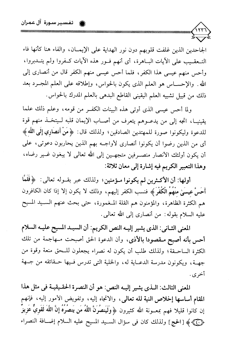 أولها: أن الأكثرين لم يكونوا مؤمنين، ولذلك عبر بقوله تعالى: (فَلَمَّا أَحَسَّ عِيسَى مِنْهُمُ الْكُفْرَ) فنسب الكفر إليهم، وذلك لَا يكون إلا إذا كان الكافرون هم الكثرة الظاهرة، والمؤمنون هم القلة المغمورة، حتى بحث عنهم السيد المسيح عليه السلام بقوله: من أنصاري إلى الله تعالى.