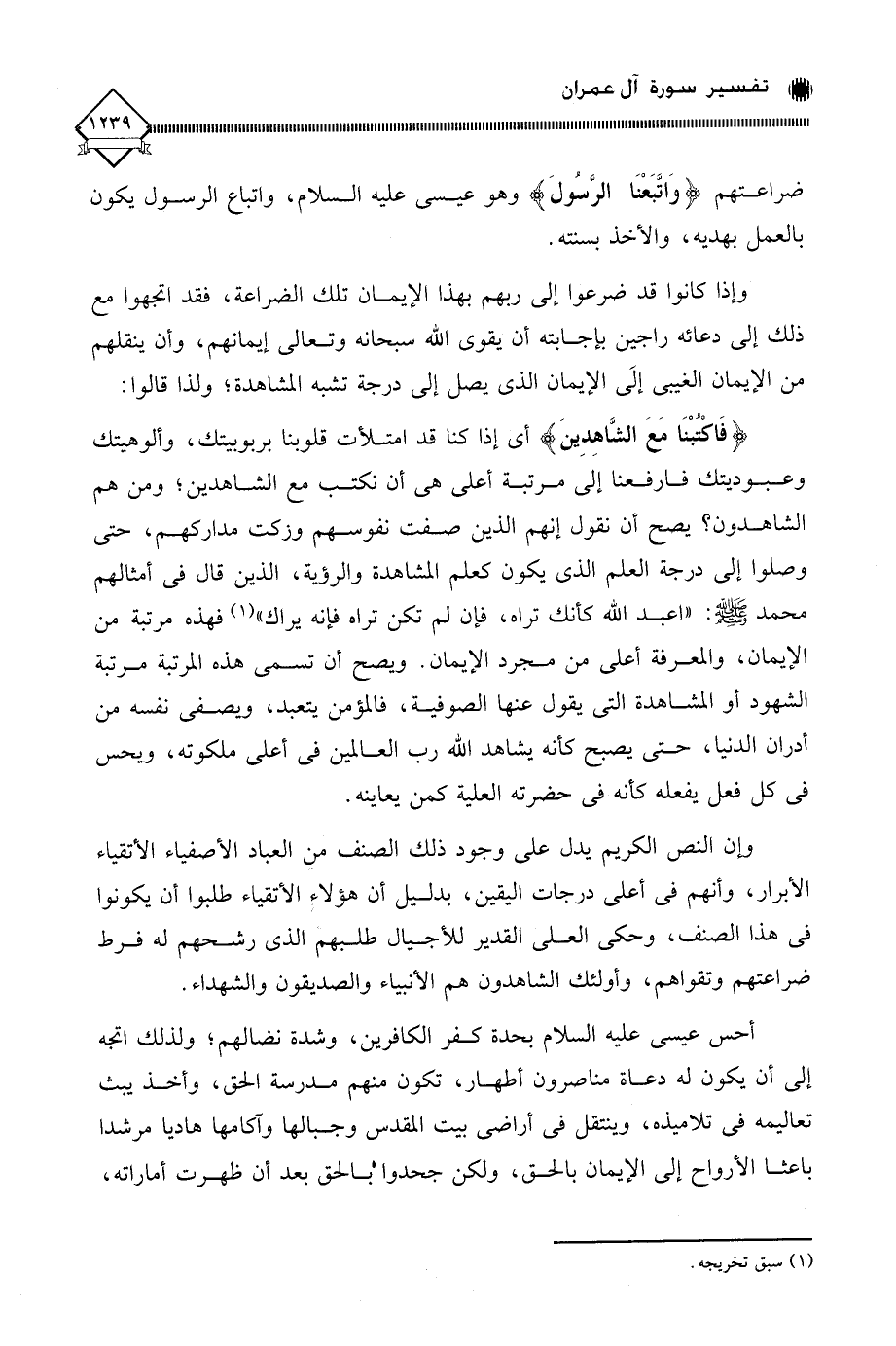 وإذا كانوا قد ضرعوا إلى ربهم بهذا الإيمان تلك الضراعة، فقد اتجهوا مع ذلك إلى دعائه راجين بإجابته أن يقوى الله سبحانه وتعالى إيمانهم، وأن ينقلهم من الإيمان الغيبي إلَى الإيمان الذي يصل إلى درجة تشبه المشاهدة، ولذا قالوا: (فَاكْتُبْنَا مَعَ الشَّاهِدِينَ) أي إذا كنا قد امتلأت قلوبنا بربوبيتك، وألوهيتك وعبوديتك فارفعنا إلى مرتبة أعلى هي أن نكتب مع الشاهدين، ومن هم الشاهدون؟ يصح أن نقول إنهم الذين صفت نفوسهم وزكت مداركهم، حتى وصلوا إلى درجة العلم الذي يكون كعلم المشاهدة والرؤية، الذين قال في أمثالهم محمد - صلى الله عليه وسلم -: " اعبد الله كأنك تراه، فإن لم تكن تراه فإنه يراك " (¬1) فهذه مرتبة من الإيمان، والمعرفة أعلى من مجرد الإيمان. ويصح أن تسمى هذه المرتبة مرتبة الشهود أو المشاهدة التي يقول عنها الصوفية، فالمؤمن يتعبد، ويصفي نفسه من أدران الدنيا، حتى يصبح كأنه يشاهد الله رب العالمين في أعلى ملكوته، ويحس في كل فعل يفعله كأنه في حضرته العلية كمن يعاينه.
