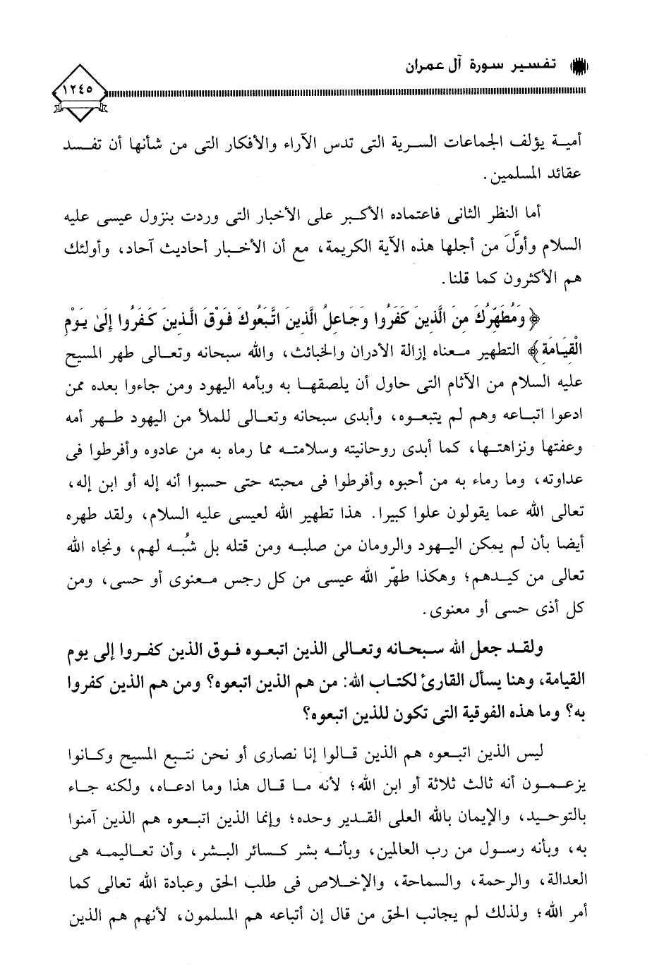 (وَمُطَهِّرُكَ مِنَ الَّذِينَ كَفَرُوا وَجَاعِلُ الَّذِينَ اتَّبَعُوكَ فَوْقَ الَّذِينَ كَفَرُوا إِلَى يَوْمِ الْقِيَامَةِ) التطهير معناه إزالة الأدران والخبائث، والله سبحانه وتعالى طهر المسيح عليه السلام من الآثام التي حاول أن يلصقها به وبأمه اليهود ومن جاءوا بعده ممن ادعوا اتباعه وهم لم يتبعوه، وأبدى سبحانه وتعالى للملأ من اليهود طهر أمه وعفتها ونزاهتها، كما أبدى روحانيته وسلامته مما رماه به من عادوه وأفرطوا في عداوته، وما رماء به من أحبوه وأفرطوا في محبته حتى حسبوا أنه إله أو ابن إله، تعالى الله عما يقولون علوا كبيرا. هذا تطهير الله لعيسى عليه السلام، ولقد طهره أيضا بأن لم يمكن اليهود والرومان من صلبه ومن قتله بل شُبه لهم، ونجاه الله تعالى من كيدهم؛ وهكذا طهّر الله عيسى من كل رجس معنوي أو حسي، ومن كل أذى حسي أو معنوي.