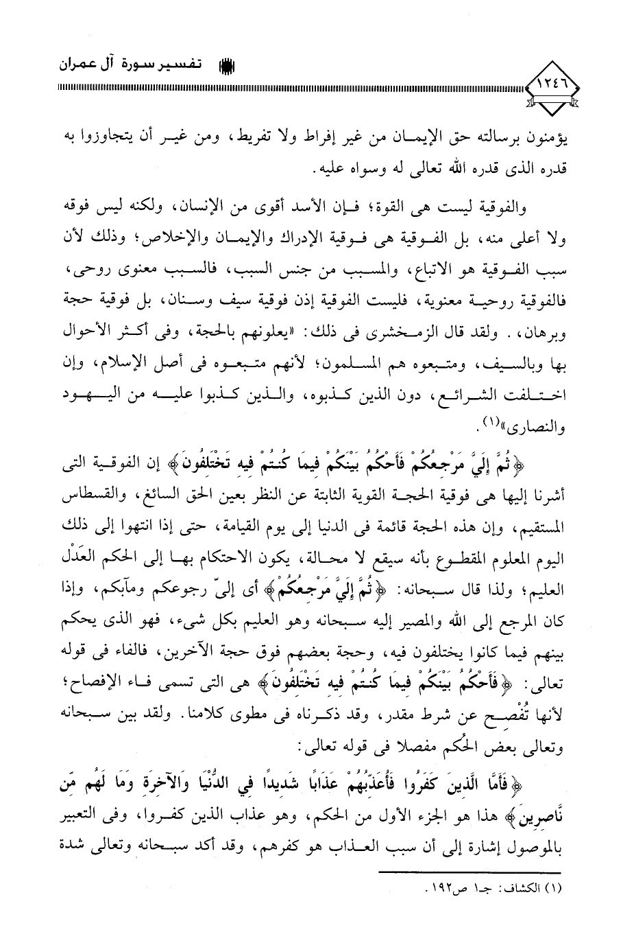 (ثُمَّ إِلَيَّ مَرْجِعُكُمْ فَأَحْكُمُ بَيْنَكُمْ فِيمَا بهُتُمْ فِيهِ تَخْتَلِفُونَ) إن الفوقية التي أشرنا إليها هي فوقية الحجة القوية الثابتة عن النظر بعين الحق السائغ، والقسطاس المستقيم، وإن هذه الحجة قائمة في الدنيا إلى يوم القيامة، حتى إذا انتهوا إلى ذلك اليوم المعلوم المقطوع بأنه لي يقع لَا محالة، يكون الاحتكام بها إلى الحكم العَدْل العليم، ولذا قال سبحانه: (ثُمَّ إِلَيَّ مَرْجِعُكُمْ) أي إليَّ رجوعكم ومآبكم، وإذا كان المرجع إلى الله والمصير إليه سبحانه وهو العليم بكل شيء، فهو الذي يحكم بينهم فيما كانوا يختلفون فيه، وحجة بعضهم فوق حجة الآخرين، فالفاء في قوله تعالى: (فَأَحْكمُ بَيْنَكمْ فِيمَا كنتمْ فِيهِ تَخْتَلِفُونَ) هي التي تسمى فاء الإفصاح، لأنها تُفْصِح عن شرط مقدر، وقد ذكرناه في مطوي كلامنا. ولقد بين سبحانه وتعالى بعض الحُكم مفصلا في قوله تعالى:
